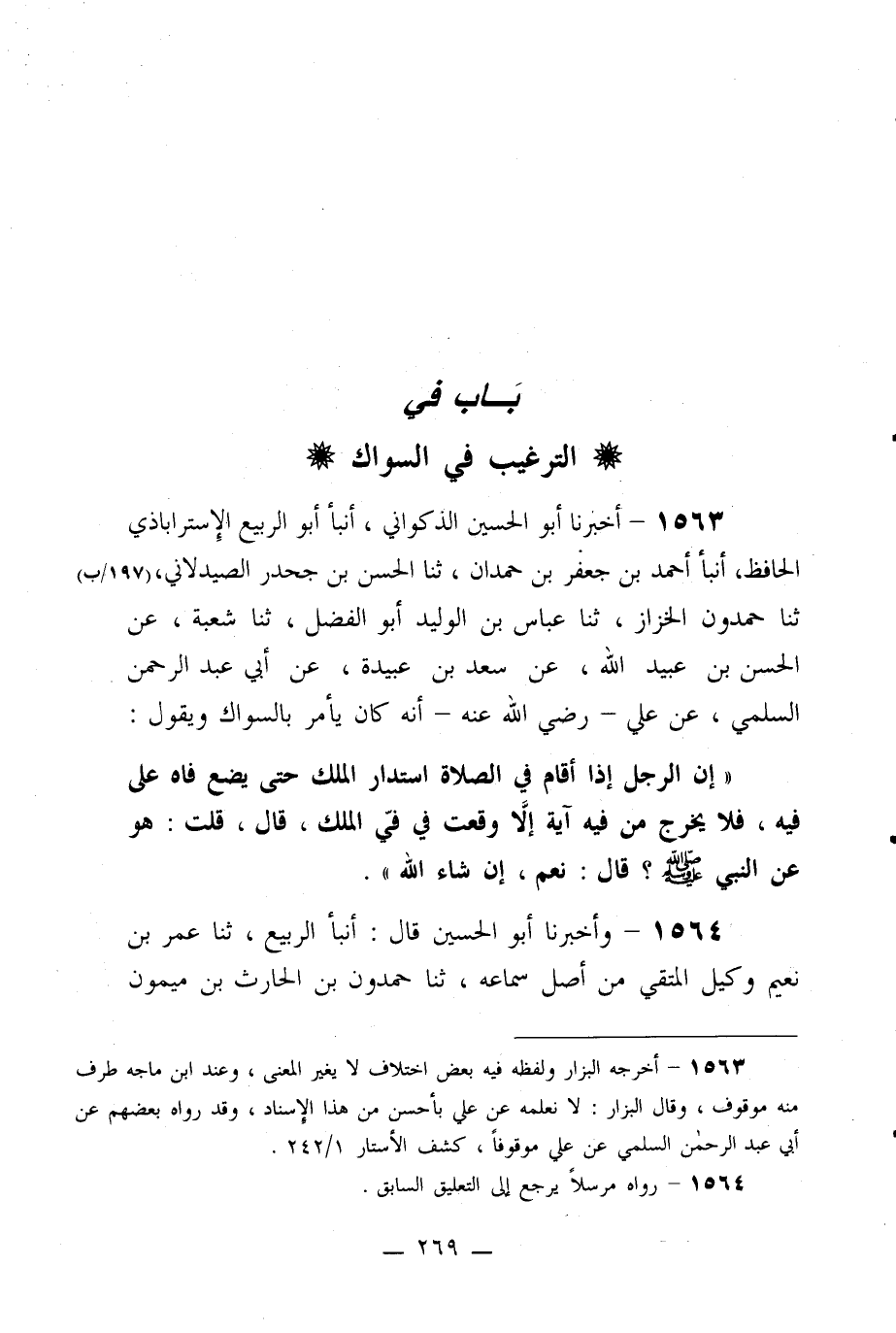 1563- أخبرنا أبو الحسين الذكواني، أنبأ أبو الربيع الإستراباذي الحافظ، أنبأ أحمد بن جعفر بن حمدان، ثنا الحسن بن جحدر الصيدلاني، ثنا حمدون الخزاز، ثنا عباس بن الوليد أبو الفضل، ثنا شعبة، عن الحسن بن عبيد الله، عن سعد بن عبيدة، عن أبي عبد الرحمن السلمي، عن علي -رضي الله عنه- أنه كان يأمر بالسواك ويقول: