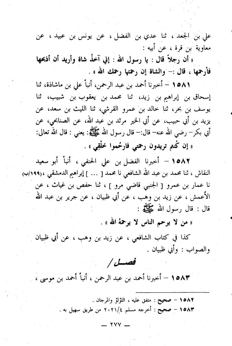 1582- أخبرنا الفضل بن علي الحنفي، أنبأ أبو سعيد النقاش، ثنا محمد بن عبد الله الشافعي نا محمد [.. ..] إبراهيم الدمشقي، نا عمار بن عمرو [الجنبي قاضي مرو] ، ثنا حفص بن غياث، عن الأعمش، عن زيد بن وهب، عن أبي ظبيان، عن جرير بن عبد الله قال: قال رسول الله صلى الله عليه وسلم: