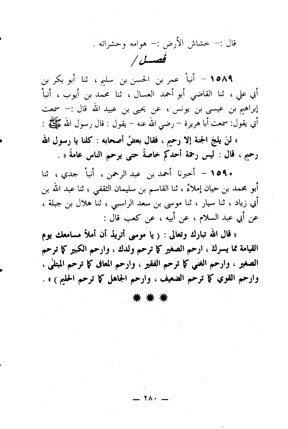 ((قال الله تبارك وتعالى: (يا موسى أتريد أن أملأ مسامعك يوم القيامة مما يسرك، ارحم الصغير كما ترحم ولدك، وارحم الكبير كما ترحم الصغير، وارحم الغني كما ترحم الفقير، وارحم المعافى كما ترحم المبتلى، وارحم القوي كما ترحم الضعيف، وارحم الجاهل كما ترحم الحليم)) .