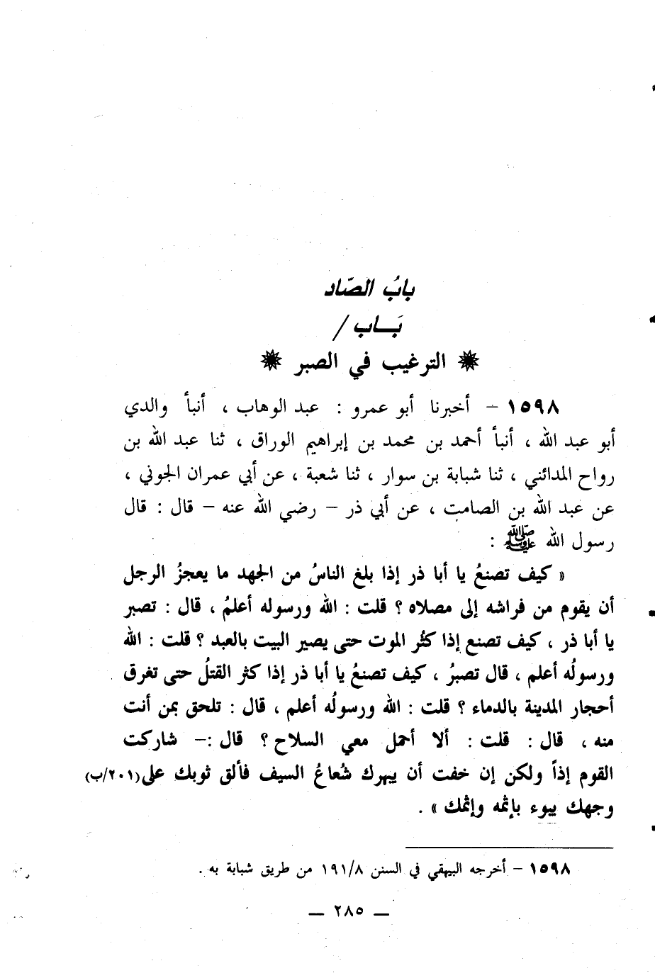 1598- أخبرنا أبو عمرو: عبد الوهاب، أنبأ والدي أبو عبد الله، أنبأ أحمد بن محمد بن إبراهيم الوراق، ثنا عبد الله بن رواح المدائني، ثنا شبابة بن سوار، ثنا شعبة، عن أبي عمران الجوني، عن عبد الله بن الصامت، عن أبي ذر -رضي الله عنه- قال: قال رسول الله صلى الله عليه وسلم: