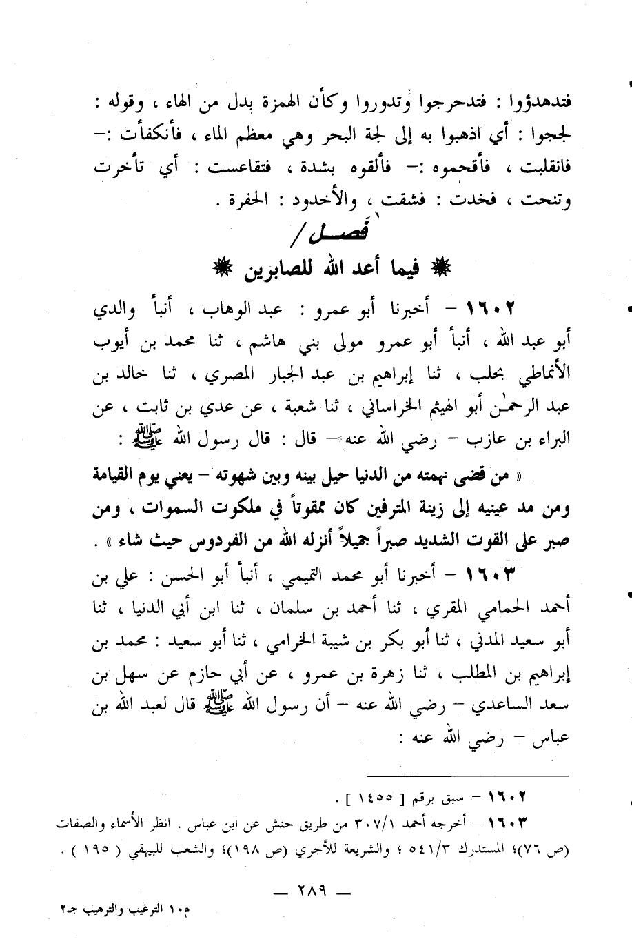 1602- أخبرنا أبو عمرو: عبد الوهاب، أنبأ والدي أبو عبد الله، أنبأ أبو عمرو مولى بني هاشم، ثنا محمد بن أيوب الأنماطي بحلب، ثنا إبراهيم بن عبد الجبار المصري، ثنا خالد بن عبد الرحمن أبو الهيثم الخراساني، ثنا شعبة، عن عدي بن ثابت، عن البراء بن عازب –رضي الله عنه- قال: قال رسول الله صلى الله عليه وسلم: