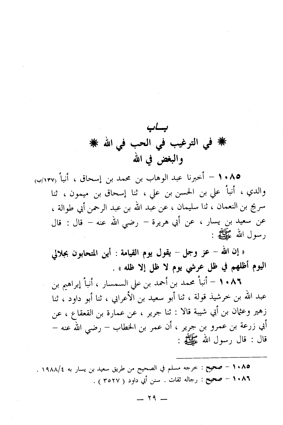 -[30]- ((إن من عباده ناساً ما هم بأنبياء ولا شهداء يغبطهم الناس لمكانهم من الله، قالوا: يا رسول الله خبرنا من هم؟ قال: هم تحابوا بروح الله على غير أرحام بينهم ولا أموال يتعاطونها فوالله إن وجوههم لنور وإنهم لعلى نور لا يخافون إذا خاف الناس، ولا يخزنون إذا حزن الناس ثم قرأ {ألا إن أولياء الله لا خوف عليهم ولا هم يحزنون} )) .