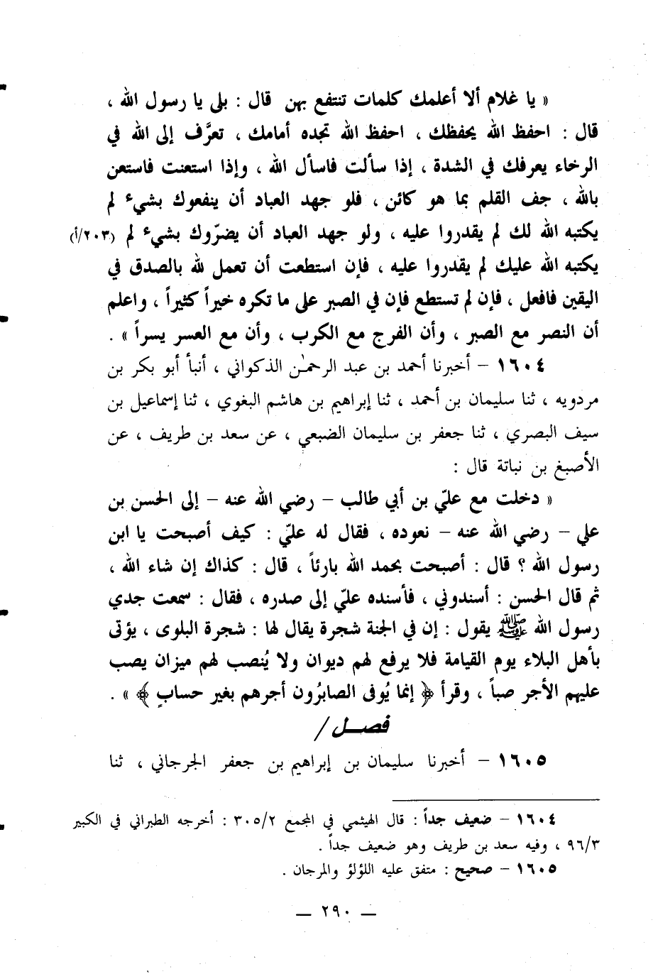 1604- أخبرنا أحمد بن عبد الرحمن الذكواني، أنبأ أبو بكر بن مردويه، ثنا سليمان بن أحمد، ثنا إبراهيم بن هاشم البغوي، ثنا إسماعيل بن سيف البصري، ثنا جعفر بن سليمان الضبعي، عن سعد بن طريف، عن الأصبغ بن نباتة قال: