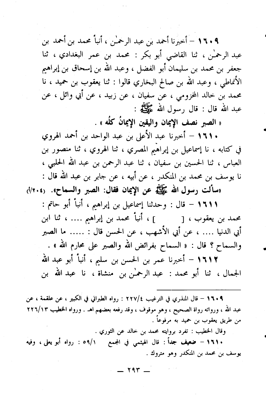 1611- قال: وحدثنا إسماعيل بن إبراهيم، أنبأ أبو حاتم: محمد بن يعقوب، [] ، أنبأ محمد بن إبراهيم.. ..، ثنا ابن أبي الدنيا.. ..، عن أبي الأشهب، عن الحسن قال:.. .. ما الصبر والسماح؟ قال: ((السماح بفرائض الله والصبر على محارم الله)) .