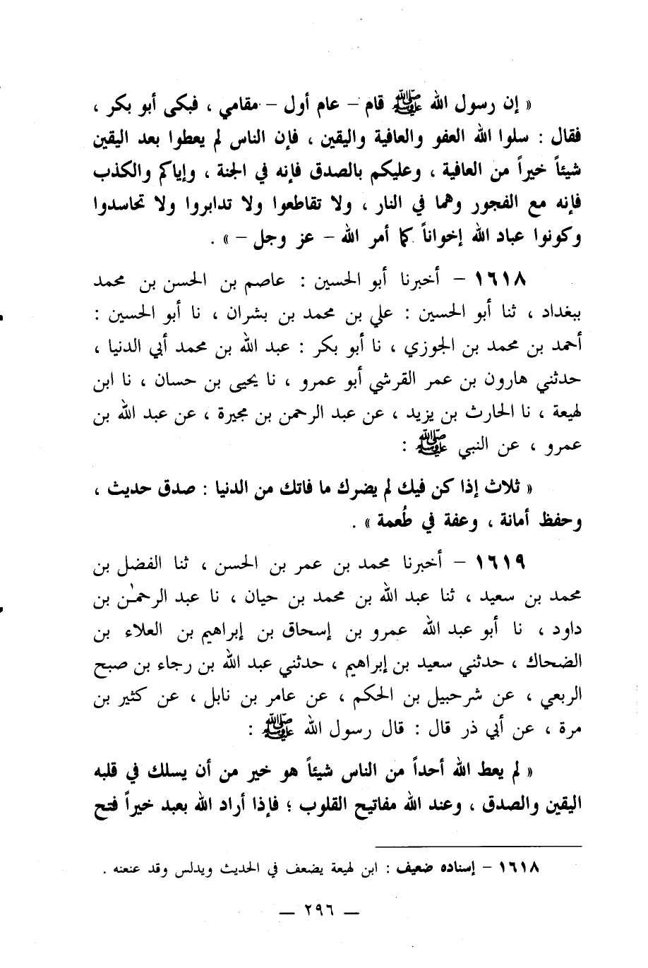 1618- أخبرنا أبو الحسين: عاصم بن الحسن بن محمد ببغداد، ثنا أبو الحسين: علي بن محمد بن بشران، نا أبو الحسين: أحمد بن محمد بن الجوزي، نا أبو بكر: عبد الله بن محمد أبي الدنيا، حدثني هارون بن عمر القرشي أبو عمرو، نا يحيى بن حسان، نا ابن لهيعة، نا الحارث بن يزيد، عن عبد الرحمن بن مجيرة، عن عبد الله بن عمرو، عن النبي صلى الله عليه وسلم: