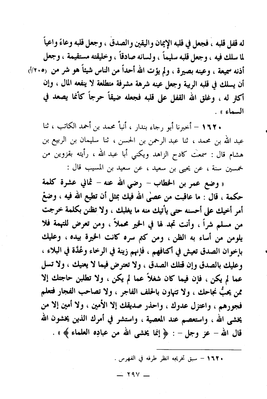 1620- أخبرنا أبو رجاء بندار، أنبأ محمد بن أحمد الكاتب، ثنا عبد الله بن محمد، ثنا عبد الرحمن بن الحسن، ثنا سليمان بن الربيع بن هشام قال: سمعت كادح الزاهد ويكنى أبا عبد الله، رأيته بقزوين من خمسين سنة، عن يحيى بن سعيد، عن سعيد بن المسيب قال: