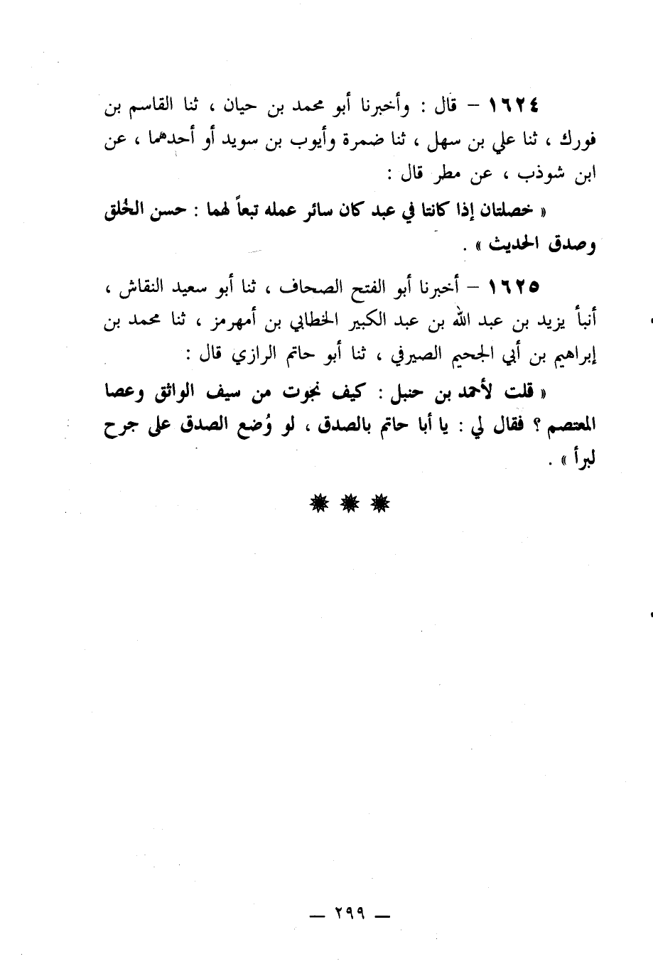 1625- أخبرنا أبو الفتح الصحاف، ثنا أبو سعيد النقاش، أنبأ يزيد بن عبد الله بن عبد الكبير الخطابي بن أمهرمز، ثنا محمد بن إبراهيم بن أبي الجحيم الصيرفي، ثنا أبو حاتم الرازي قال: