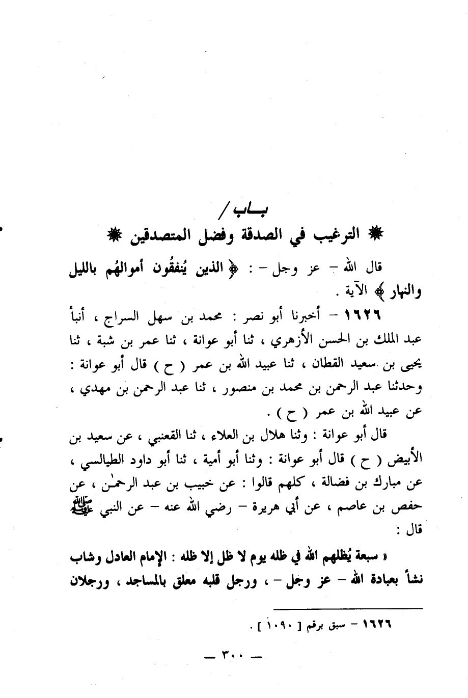 ((سبعة يظلهم الله في ظله يوم لا ظل إلا ظله: الإمام العادل وشاب نشأ بعبادة الله -عز وجل-، ورجل قلبه معلق بالمساجد، ورجلان -[301]- تحابا في الله اجتمعا عليه وتفرقا عليه، ورجل طلبته امرأة ذات منصب وجمال، فقال: إني أخاف الله -عز وجل-، ورجل تصدق بصدقة فأخفاها لم تعلم يمينه ما تنفق شماله، ورجل ذكر الله -عز وجل- خالياً ففاضت عيناه)) .