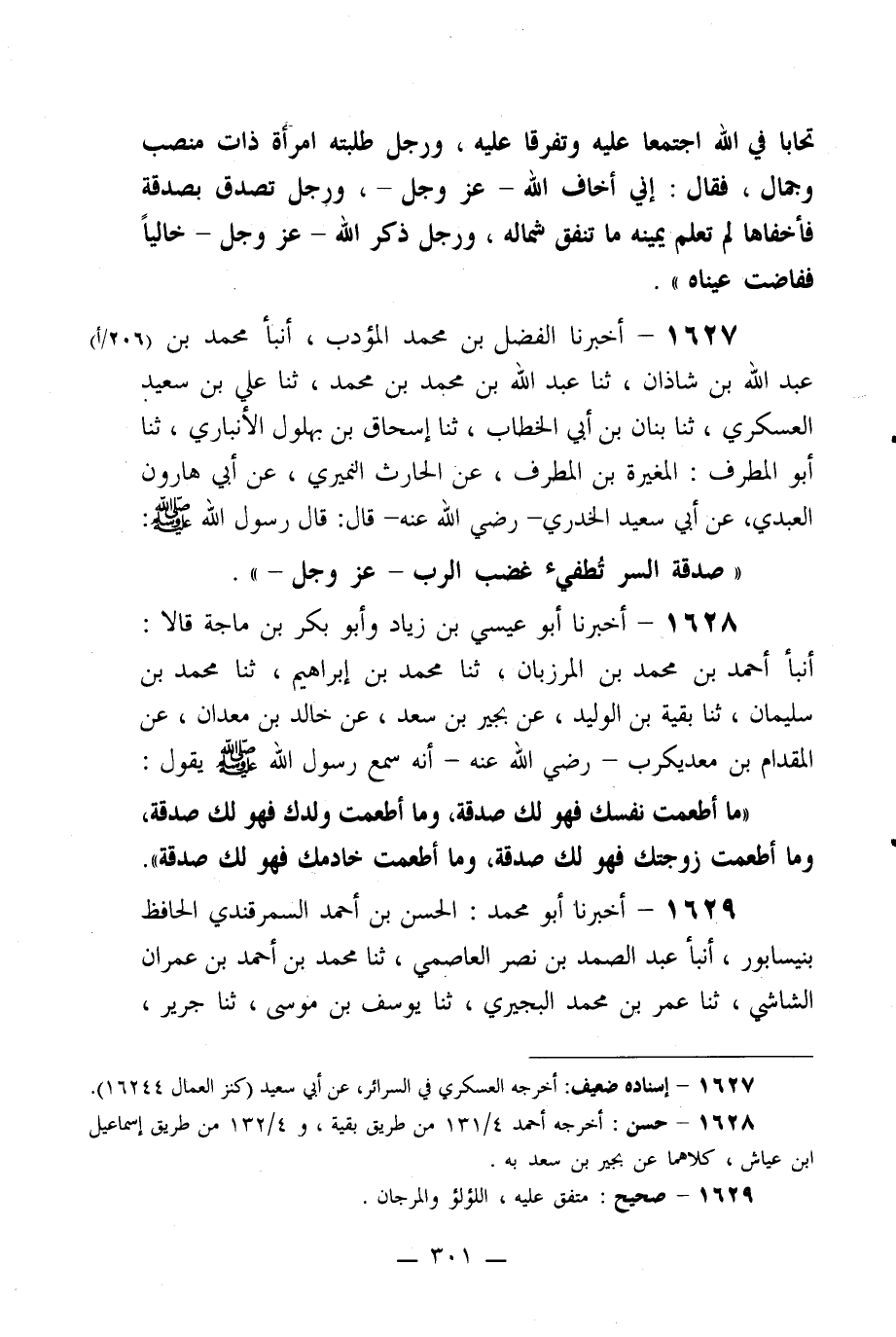 1628- أخبرنا أبو عيسى بن زياد وأبو بكر بن ماجة قالا: أنبأ أحمد بن محمد بن المرزبان، ثنا محمد بن إبراهيم، ثنا محمد بن سليمان، ثنا بقية بن الوليد، عن بجير بن سعد، عن خالد بن معدان، عن المقدام بن معديكرب –رضي الله عنه- أنه سمع رسول الله صلى الله عليه وسلم يقول:
