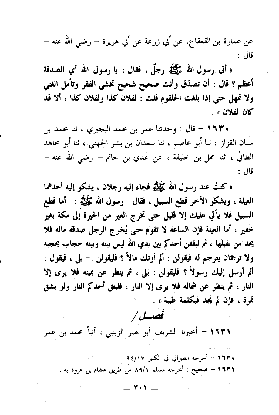 1630- قال: وحدثنا عمر بن محمد البجيري، ثنا محمد بن سنان القزاز، ثنا أبو عاصم، ثنا سعدان بن بشر الجهني، ثنا أبو مجاهد الطائي، ثنا محل بن خليفة، عن عدي بن حاتم –رضي الله عنه- قال: