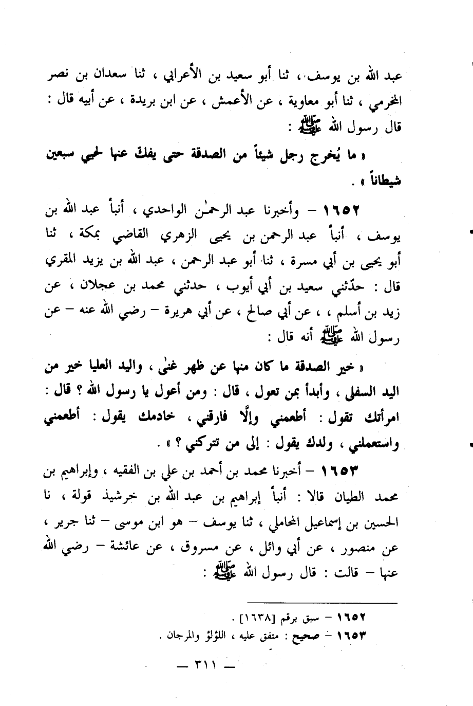 -[312]- ((إذا أنفقت المرأة من طعام بيتها غير مفسدة كان لها أجر بما أنفقت ولزوجها أجر بما اكتسبت، وللخازن مثل ذلك لا ينقص بعضهم من أجر بعض شيئاً)) .
