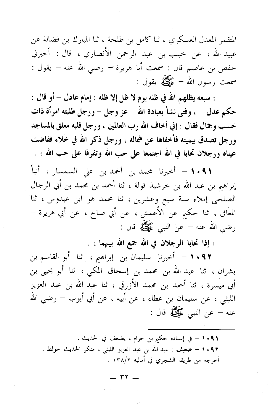 1091- أخبرنا محمد بن أحمد بن علي السمسار، أنبأ إبراهيم بن عبد الله بن خرشيذ قولة، ثنا أحمد بن محمد بن أبي الرجال الصلحي إملاء سنة سبع وعشرين، ثنا محمد هو ابن عبدوس، ثنا المعافى، ثنا حكيم عن الأعمش، عن أبي صالح، عن أبي هريرة –رضي الله عنه- عن النبي صلى الله عليه وسلم قال: