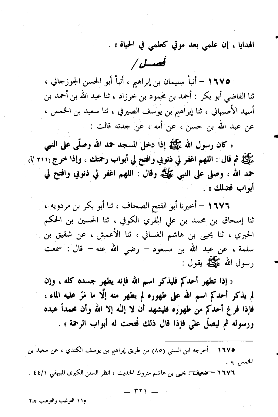 1675- أنبأ سليمان بن إبراهيم، أنبأ أبو الحسن الجوزجاني، ثنا القاضي أبو بكر: أحمد بن محمود بن خرزاد، ثنا عبد الله بن أحمد بن أسيد الأصبهاني، ثنا إبراهيم بن يوسف الصيرفي، ثنا سعيد بن الخمس، عن عبد الله بن حسن، عن أمه، عن جدته قالت: