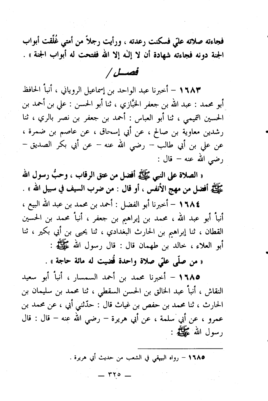 1685- أخبرنا محمد بن أحمد السمسار، أنبأ أبو سعيد النقاش، أنبأ عبد الخالق بن الحسن السقطي، ثنا محمد بن سليمان بن الحارث، ثنا محمد بن حفص بن غياث قال: حدثني أبي، عن محمد بن عمرو، عن أبي سلمة، عن أبي هريرة –رضي الله عنه- قال: قال رسول الله صلى الله عليه وسلم: