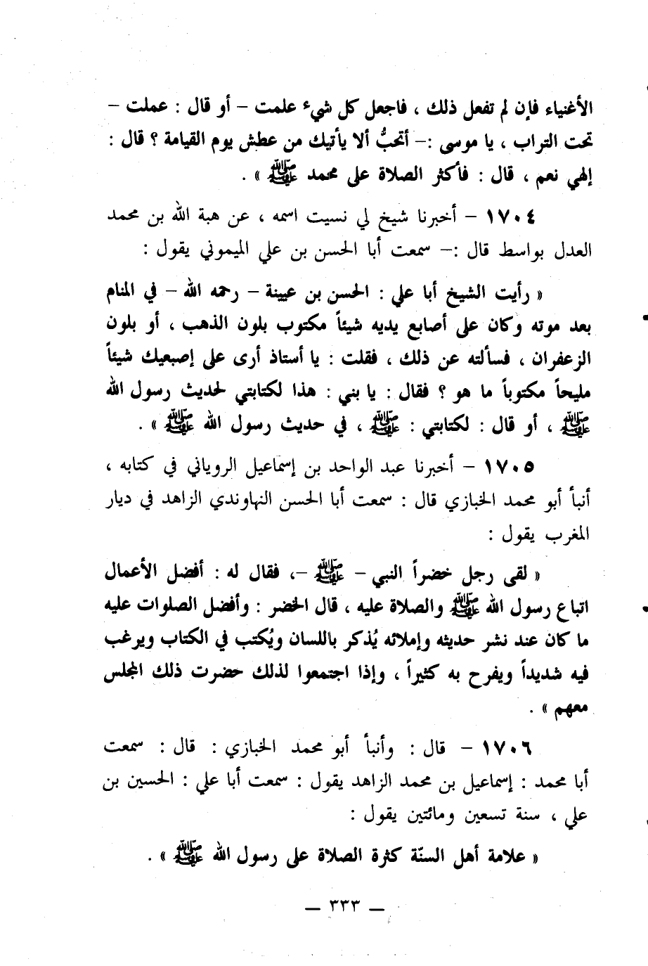 ((لقى رجل خضراً النبي صلى الله عليه وسلم، فقال له: أفضل الأعمال اتباع رسول الله صلى الله عليه وسلم والصلاة عليه، قال الخضر: وأفضل الصلوات عليه ما كان عند نشر حديثه وإملائه يذكر باللسان ويكتب في الكتاب ويرغب فيه شديداً ويفرح به كثيراً، وإذا اجتمعوا لذلك حضرت ذلك المجلس معهم)) .
