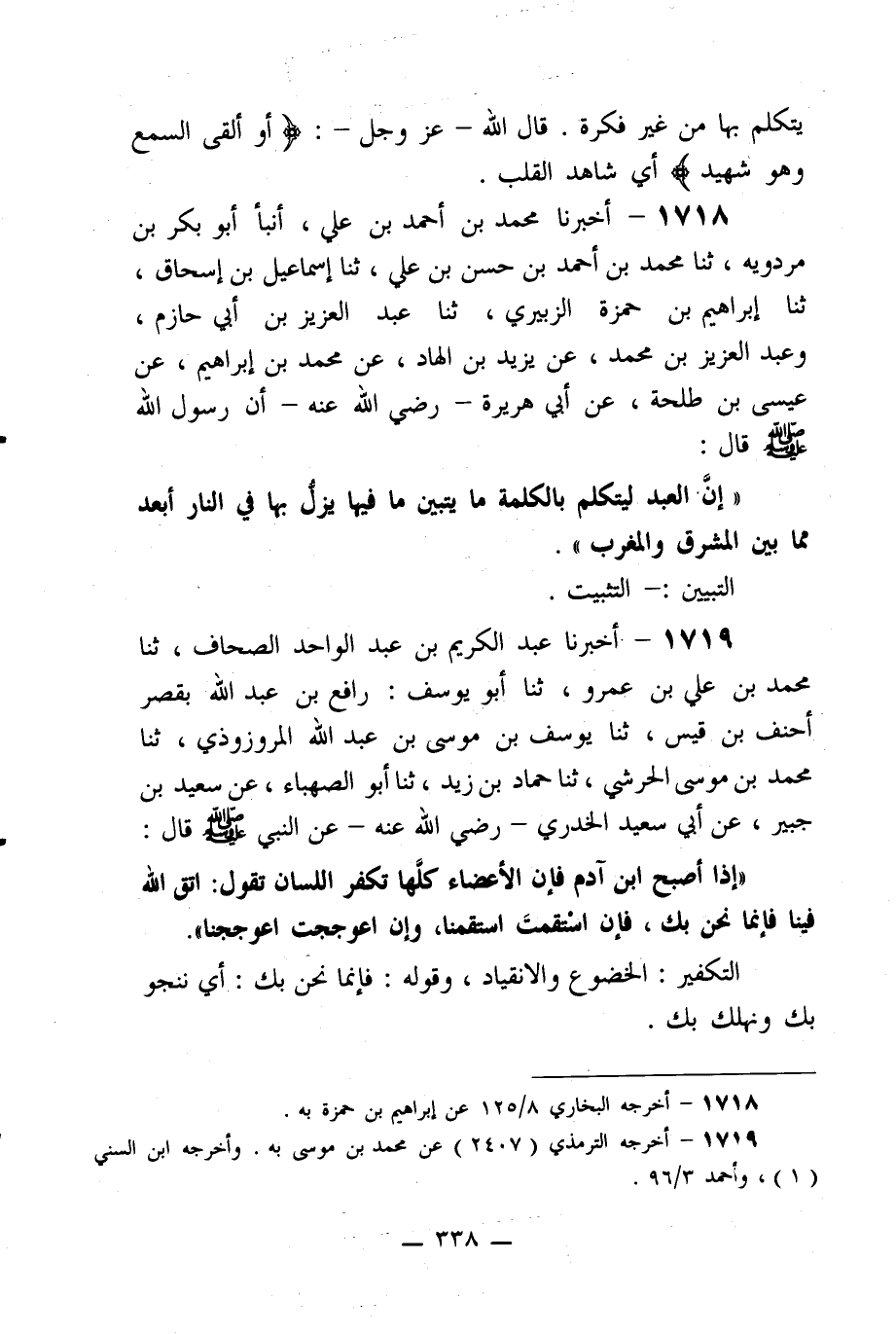 1718- أخبرنا محمد بن أحمد بن علي، أنبأ أبو بكر بن مردويه، ثنا محمد بن أحمد بن حسن بن علي، ثنا إسماعيل بن إسحاق، ثنا إبراهيم بن حمزة الزبيري، ثنا عبد العزيز بن أبي حازم، وعبد العزيز بن محمد، عن يزيد بن الهاد، عن محمد بن إبراهيم، عن عيسى بن طلحة، عن أبي هريرة -رضي الله عنه- أن رسول الله صلى الله عليه وسلم قال: