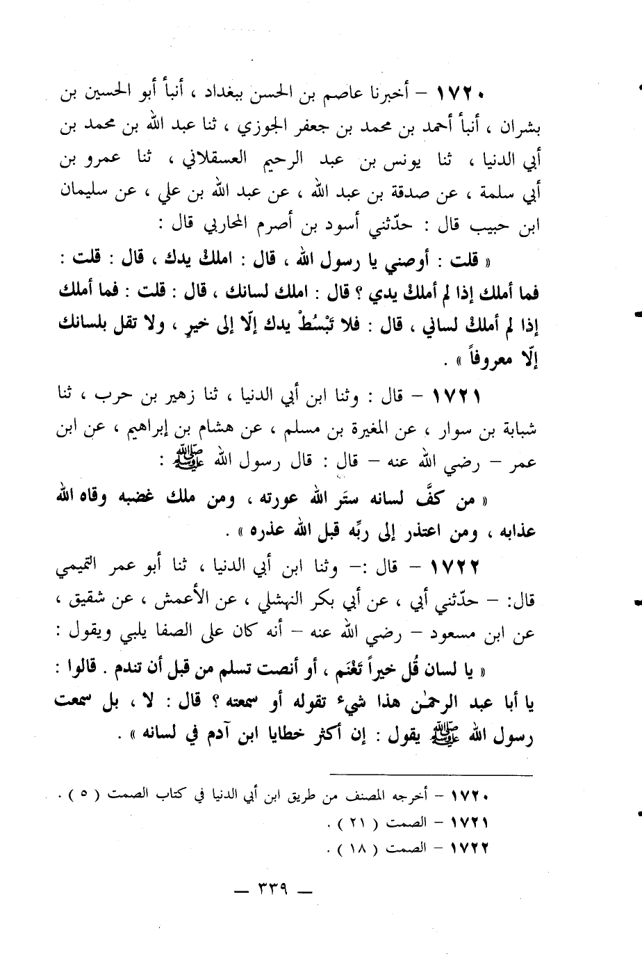 ((يا لسان قل خيراً تغنم، أو أنصت تسلم من قبل أن تندم. قالوا: يا أبا عبد الرحمن هذا شيء تقوله أو سمعته؟ قال: لا، بل سمعت رسول الله صلى الله عليه وسلم يقول: إن أكثر خطايا ابن آدم في لسانه)) .