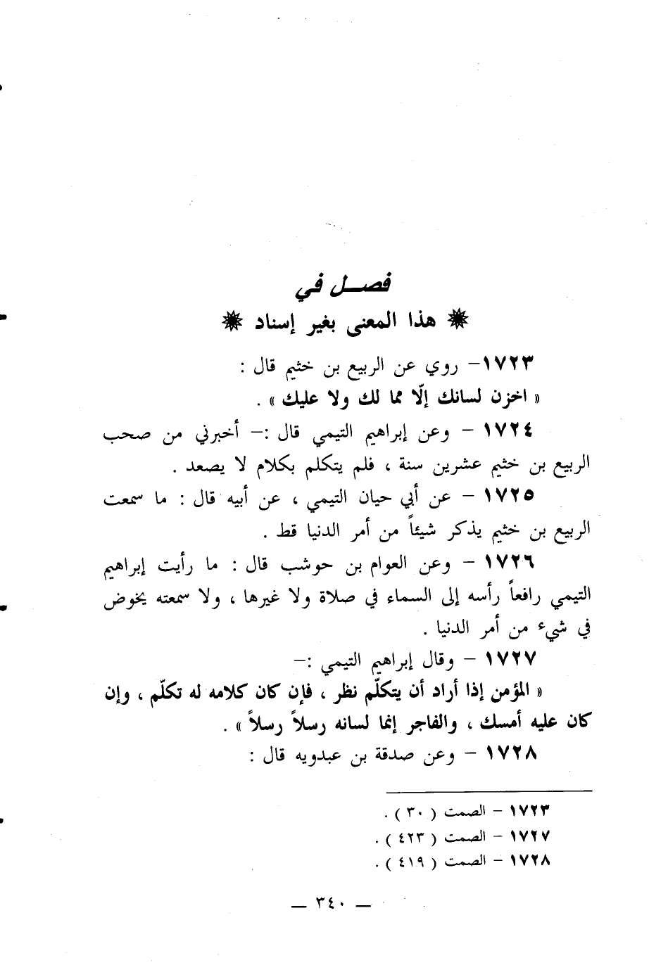 1724- وعن إبراهيم التيمي قال: -أخبرني من صحب الربيع بن خثيم عشرين سنة، فلم يتكلم بكلام لا يصعد.