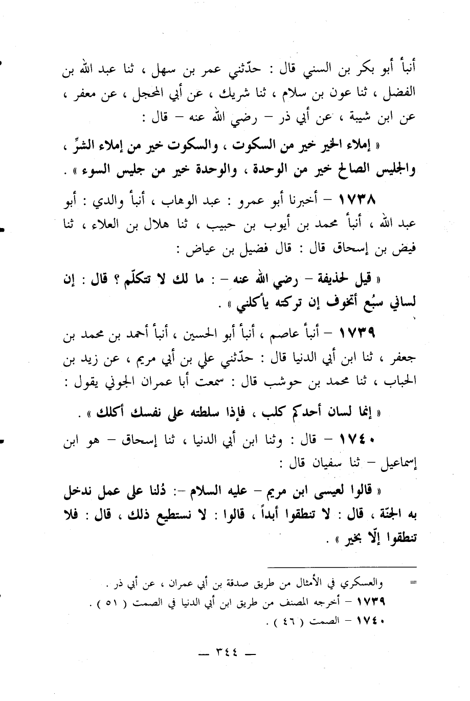 1740- قال: وثنا ابن أبي الدنيا، ثنا إسحاق –هو ابن إسماعيل- ثنا سفيان قال: