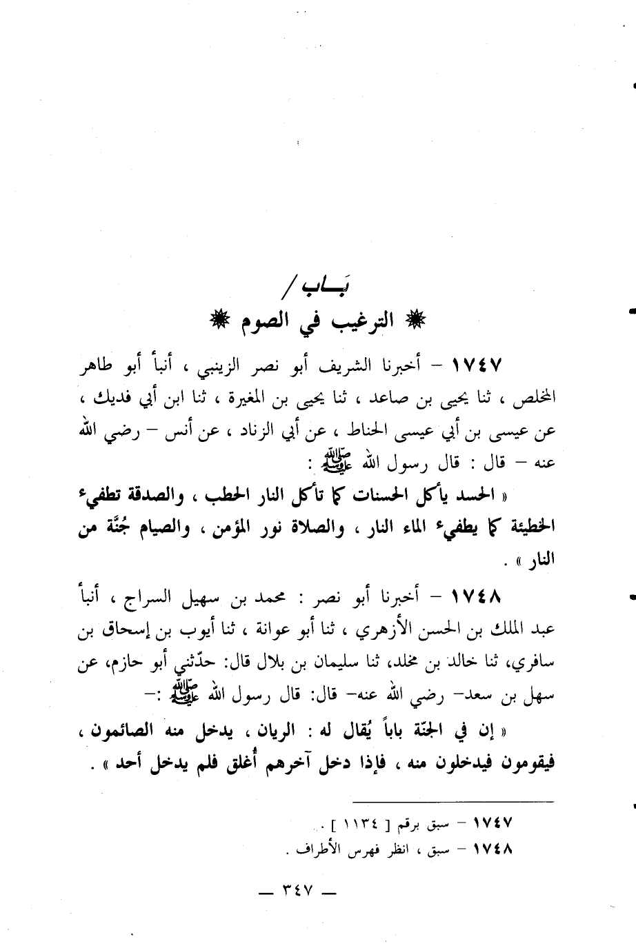 1748- أخبرنا أبو نصر: محمد بن سهل السراج، أنبأ عبد الملك بن الحسن الأزهري، ثنا أبو عوانة، ثنا أيوب بن إسحاق بن سافري، ثنا خالد بن مخلد، ثنا سليمان بن بلال قال: حدثني أبو حازم، عن سهل بن سعد –رضي الله عنه- قال: قال رسول الله صلى الله عليه وسلم: