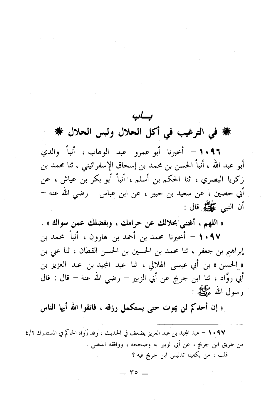 1097- أخبرنا محمد بن أحمد بن هارون، أنبأ محمد بن إبراهيم بن جعفر، ثنا محمد بن الحسين بن الحسن القطان، ثنا علي بن ((الحسن)) بن أبي عيسى الهلالي، ثنا عبد المجيد بن عبد العزيز بن أبي رواد، ثنا ابن جريج عن أبي الزبير –رضي الله عنه- قال: قال رسول الله صلى الله عليه وسلم: