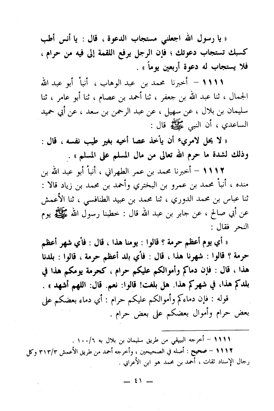 1111- أخبرنا محمد بن عبد الوهاب، أنبأ أبو عبد الله الجمال، ثنا عبد الله بن جعفر، ثنا أحمد بن عصام، ثنا أبو عامر، ثنا سليمان بن بلال، عن سهيل، عن عبد الرحمن بن سعد، عن أبي حميد الساعدي، أن النبي صلى الله عليه وسلم قال: