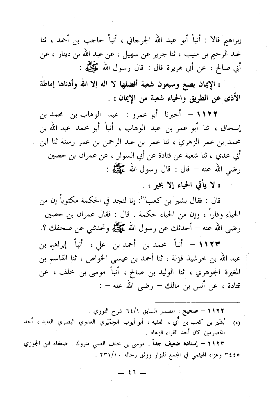 قال: فقال بشير بن كعب: إنا لنجد في الحكمة مكتوباً إن من الحياء وقاراً، وإن من الحياء حكمة. قال: فقال عمران بن حصين –رضي الله عنه- أحدثك عن رسول الله صلى الله عليه وسلم وتحدثني عن صحفك؟!