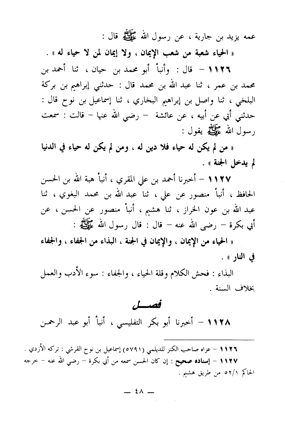 1127- أخبرنا أحمد بن علي المقرئ، أنبأ هبة الله بن الحسن الحافظ، أنبأ منصور بن علي، ثنا عبد الله بن محمد البغوي، ثنا عبد الله بن عون الخراز، ثنا هشيم، أنبأ منصور عن الحسن، عن أبي بكرة –رضي الله عنه- قال: قال رسول الله صلى الله عليه وسلم: