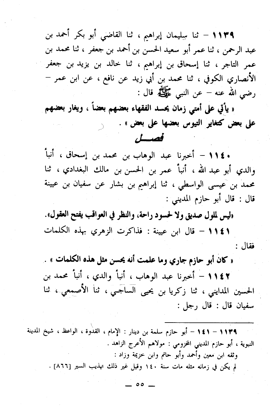 1140- أخبرنا عبد الوهاب بن محمد بن إسحاق، أنبأ والدي أبو عبد الله، أنبأ عمر بن الحسن بن مالك البغدادي، ثنا محمد بن عيسى الواسطي، ثنا إبراهيم بن بشار عن سفيان بن عيينة قال: قال أبو حازم المديني: