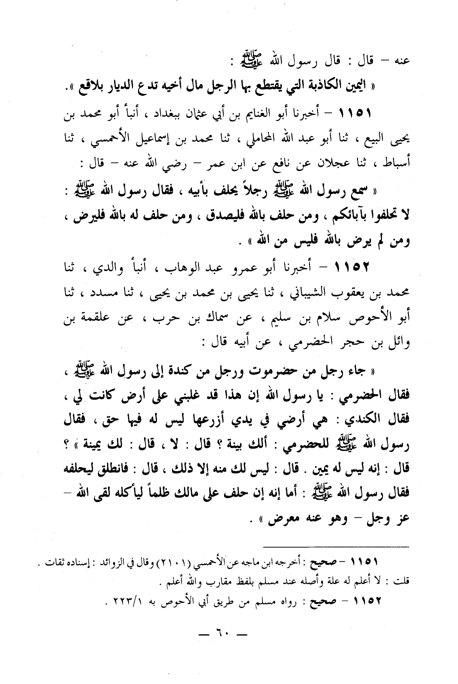 1151- أخبرنا أبو الغنايم بن أبي عثمان ببغداد، أنبأ أبو محمد بن يحيى البيع، ثنا أبو عبد الله المحاملي، ثنا محمد بن إسماعيل الأحمسي، ثنا أسباط، ثنا عجلان عن نافع عن ابن عمر –رضي الله عنه- قال: