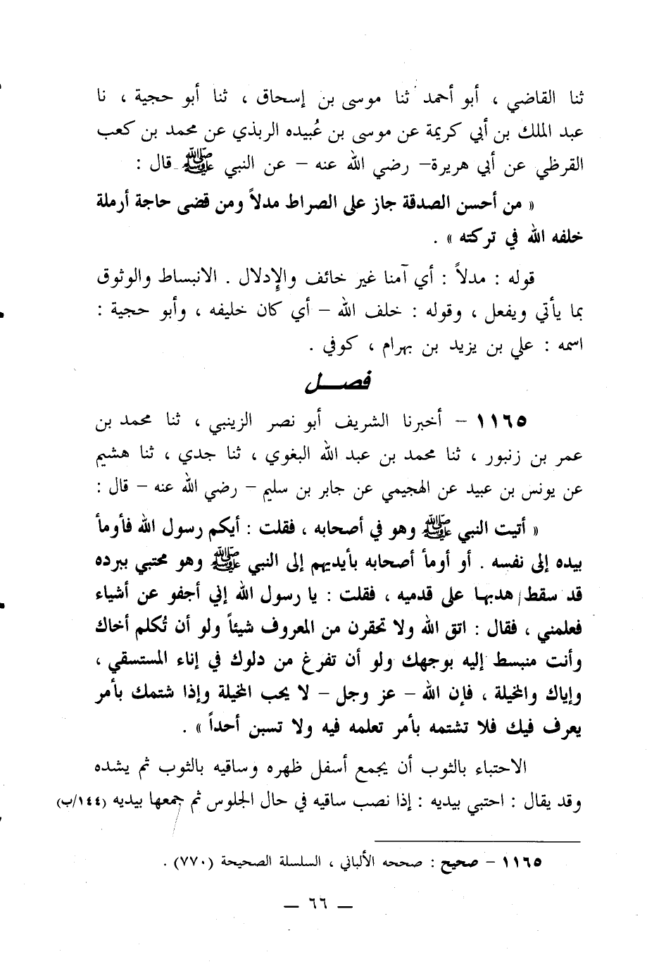 1165- أخبرنا الشريف أبو نصر الزينبي، ثنا محمد بن عمر بن زنبور، ثنا محمد بن عبد الله البغوي، ثنا جدي، ثنا هشيم عن يونس بن عبيد عن الهجيمي عن جابر بن سليم –رضي الله عنه- قال: