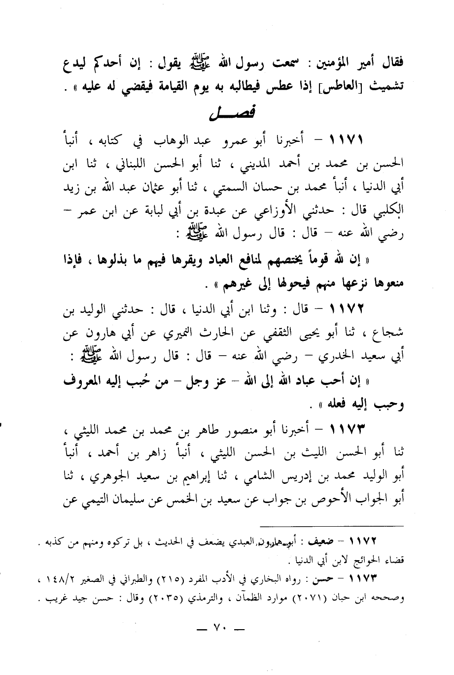 1172- قال: وثنا ابن أبي الدنيا، قال: حدثني الوليد بن شجاع، ثنا أبو يحيى الثقفي عن الحارث النميري عن أبي هارون عن أبي سعيد الخدري –رضي الله عنه- قال: قال رسول لله صلى الله عليه وسلم: