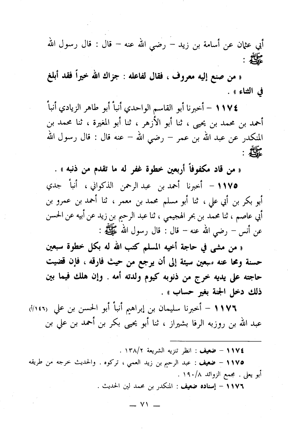 1174- أخبرنا أبو القاسم الواحدي أنبأ أبو طاهر الزيادي أنبأ أحمد بن محمد بن يحيى، ثنا أبو الأزهر، ثنا أبو المغيرة، ثنا محمد بن المنكدر عن عبد الله بن عمر –رضي الله عنه- قال: قال رسول الله صلى الله عليه وسلم: