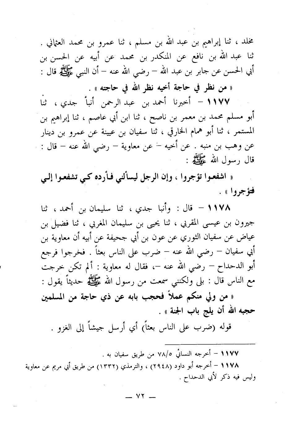 1177- أخبرنا أحمد بن عبد الرحمن أنبأ جدي، ثنا أبو مسلم محمد بن معمر بن ناصح، ثنا ابن أبي عاصم، ثنا إبراهيم بن المستمر، ثنا أبو همام الخارقي، ثنا سفيان بن عيينة عن عمرو بن دينار عن وهب بن منبه. عن أخيه –عن معاوية- رضي الله عنه- قال: قال رسول الله صلى الله عليه وسلم: