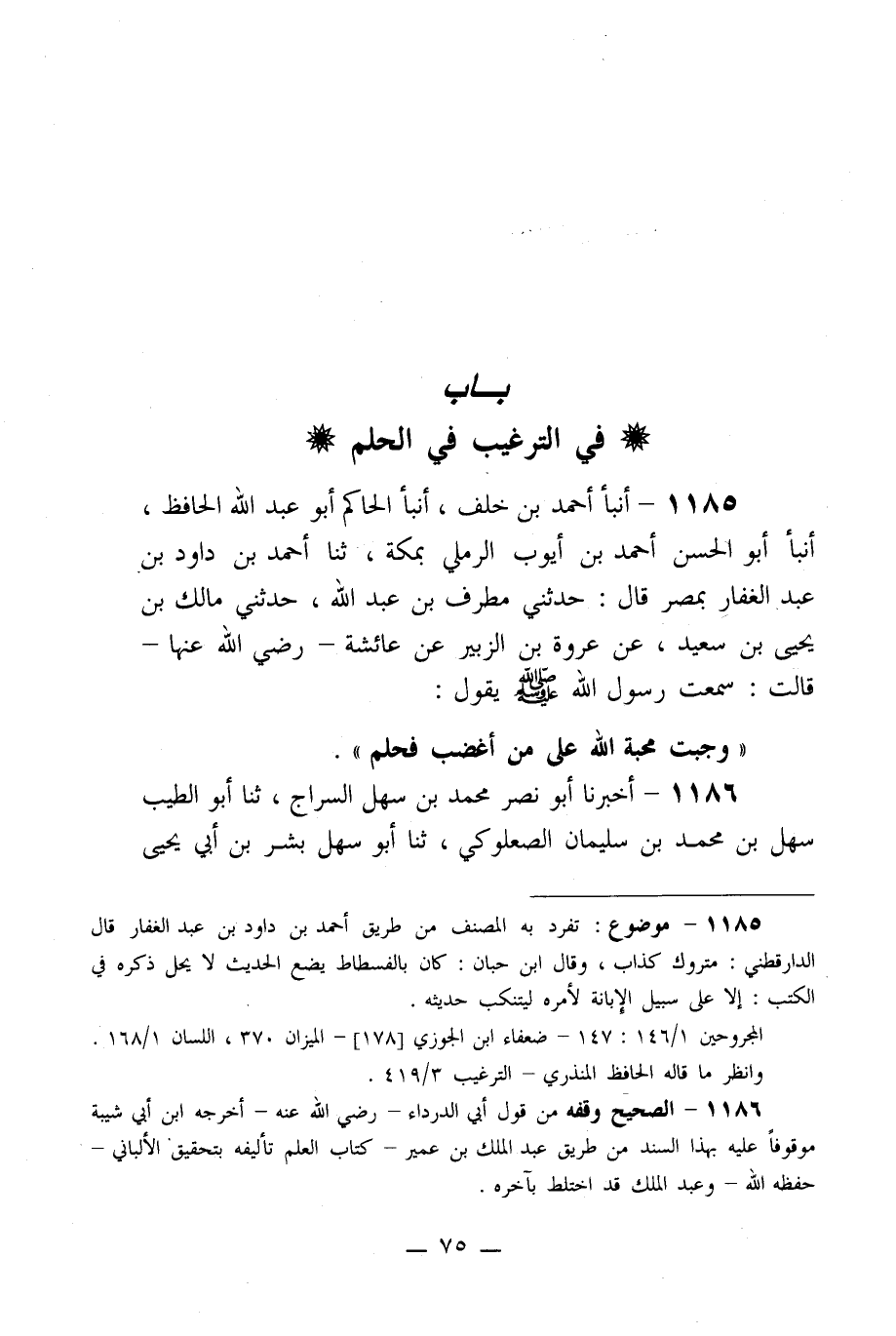 1186- أخبرنا أبو نصر محمد بن سهل السراج، ثنا أبو الطيب سهل بن محمد بن سليمان الصعلوكي، ثنا أبو سهل بشر بن أبي يحيى -[76]- المهرجاني، ثنا عبد الله بن ناجية، ثنا أحمد بن يحيى الخلال، ثنا محمد بن الحسن عن سفيان عن عبد الملك بن عمير عن رجاء بن حيوة عن أبي الدرداء –رضي الله عنه- قال رسول الله صلى الله عليه وسلم:
