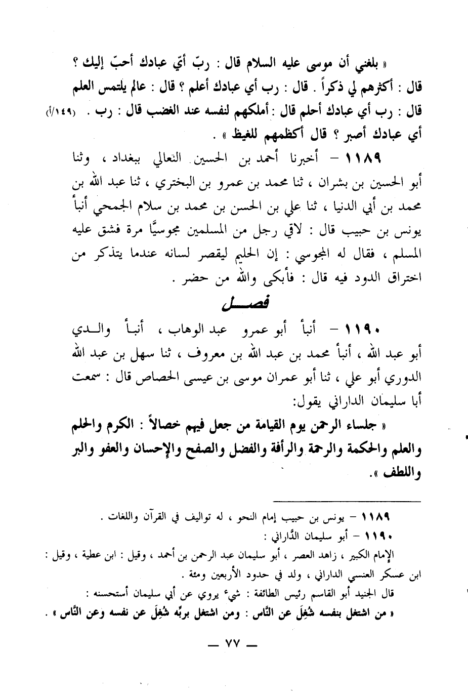 1190- أنبأ أبو عمرو عبد الوهاب، أنبأ والدي أبو عبد الله، أنبأ محمد بن عبد الله بن معروف، ثنا سهل بن عبد الله الدوري أبو علي، ثنا أبو عمران موسى بن عيسى الحصاص قال: سمعت أبا سليمان الداراني يقول: