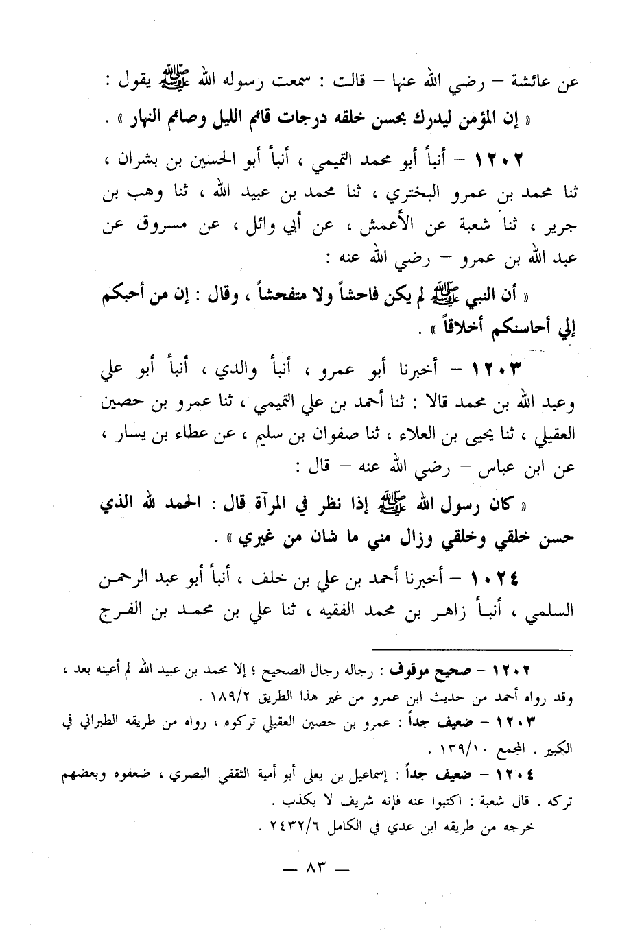 1202- أنبأ أبو محمد التميمي، أنبأ أبو الحسين بن بشران، ثنا محمد بن عمرو البختري، ثنا محمد بن عبيد الله، ثنا وهب بن جرير، ثنا شعبة عن الأعمش، عن أبي وائل، عن مسروق عن عبد الله بن عمرو –رضي الله عنه-: