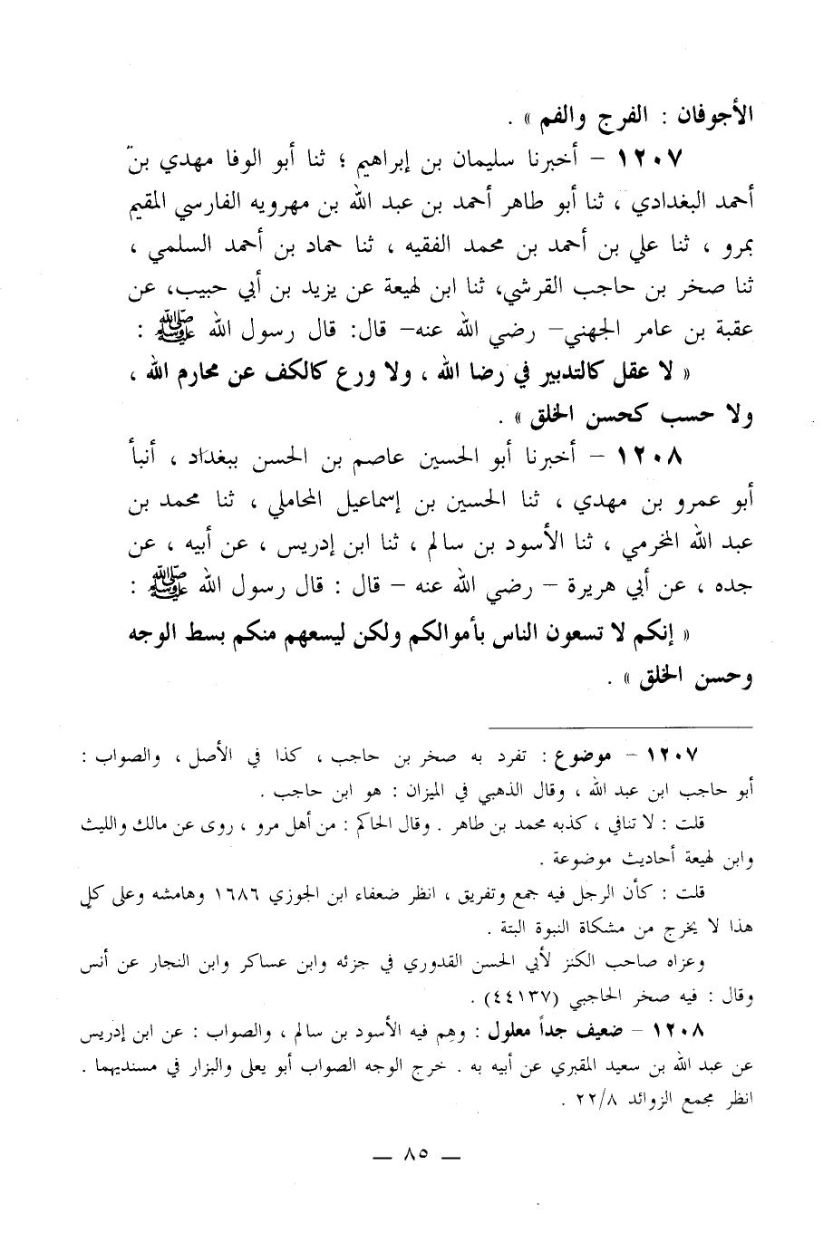 1208- أخبرنا أبو الحسين عاصم بن الحسن ببغداد، أنبأ أبو عمرو بن مهدي، ثنا الحسين بن إسماعيل المحاملي، ثنا محمد بن عبد الله المخرمي، ثنا الأسود بن سالم، ثنا ابن إدريس، عن أبيه، عن جده، عن أبي هريرة -رضي الله عنه- قال: قال رسول الله صلى الله عليه وسلم: