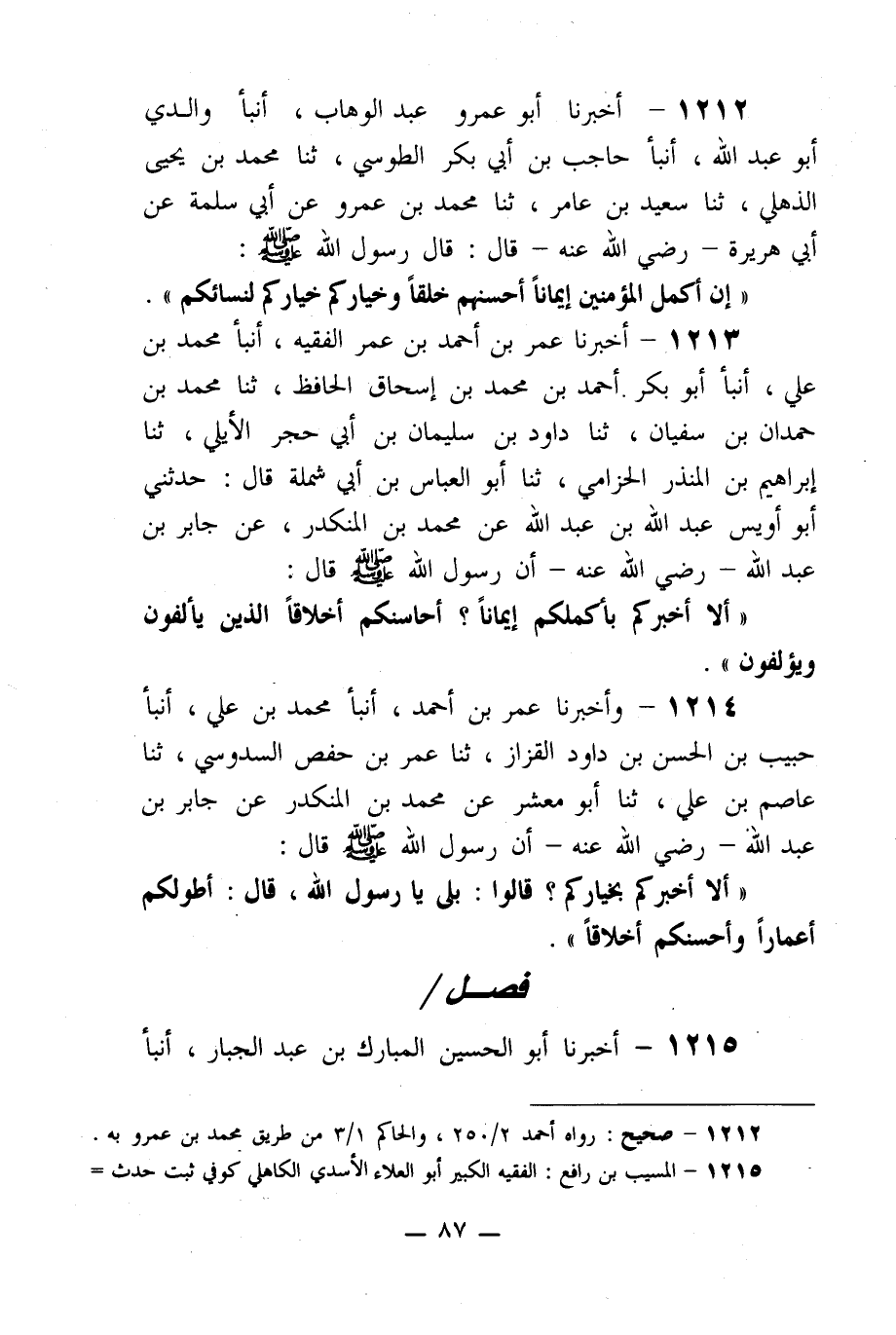 1212- أخبرنا أبو عمرو عبد الوهاب، أنبأ والدي أبو عبد الله، أنبأ حاجب بن أبي بكر الطوسي، ثنا محمد بن يحيى الذهلي، ثنا سعيد بن عامر، ثنا محمد بن عمرو عن أبي سلمة عن أبي هريرة -رضي الله عنه- قال: قال رسول الله صلى الله عليه وسلم:
