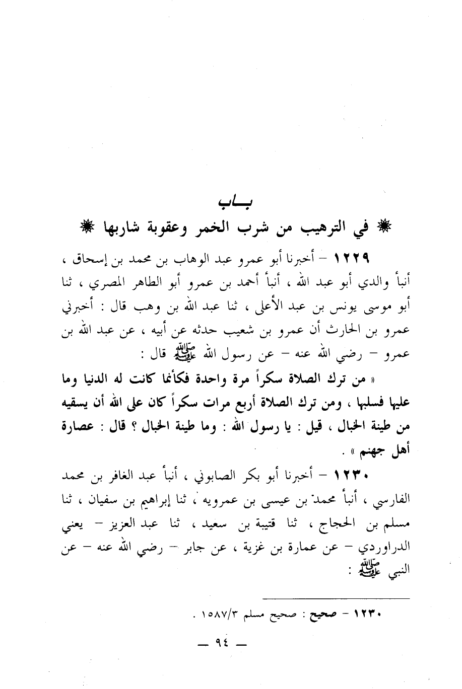 1229- أخبرنا أبو عمرو عبد الوهاب بن محمد بن إسحاق، أنبأ والدي أبو عبد الله، أنبأ أحمد بن عمرو أبو الطاهر المصري، ثنا أبو موسى يونس بن عبد الأعلى، ثنا عبد الله بن وهب قال: أخبرني عمرو بن الحارث أن عمرو بن شعيب حدثه عن أبيه، عن عبد الله بن عمرو –رضي الله عنه- عن رسول الله صلى الله عليه وسلم قال: