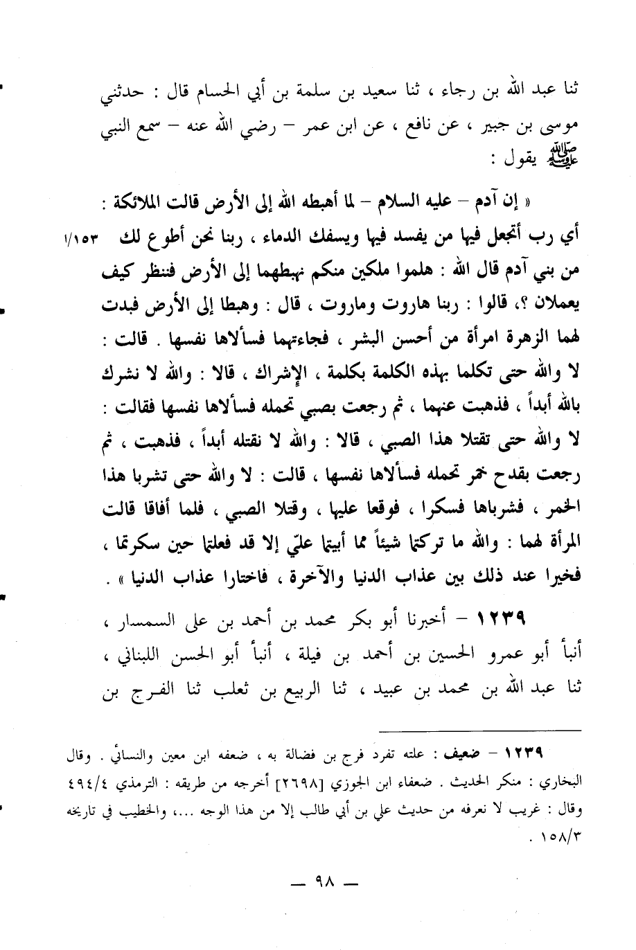 1239- أخبرنا أبو بكر محمد بن أحمد بن علي السمسار، أنبأ أبو عمرو الحسين بن أحمد بن فيلة، أنبأ أبو الحسن اللبناني، ثنا عبد الله بن محمد بن عبيد، ثنا الربيع بن ثعلب ثنا الفرج بن -[99]- فضالة، عن يحيى بن سعيد، عن محمد بن علي عن علي –رضي الله عنه- قال رسول الله صلى الله عليه وسلم:
