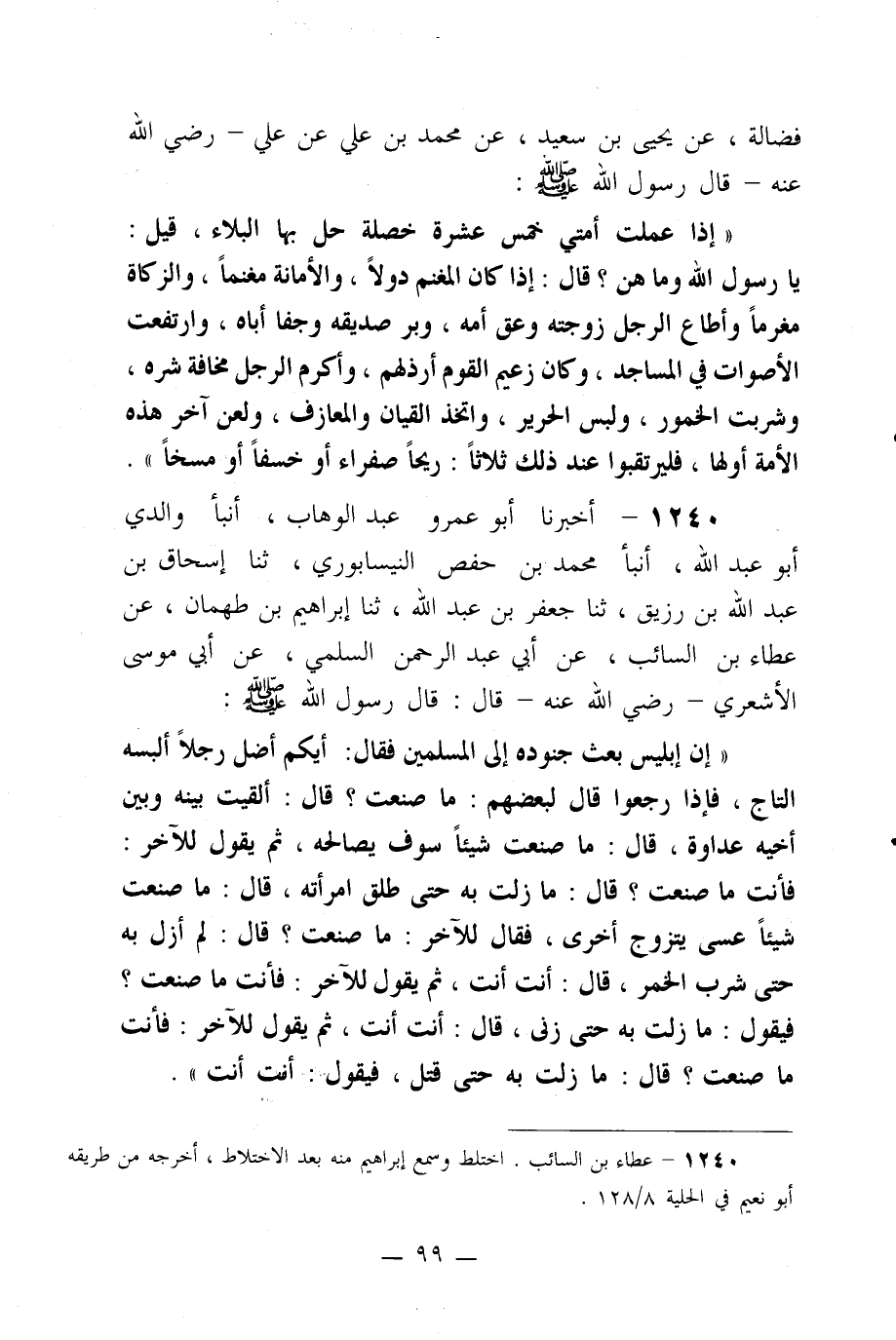 1240- أخبرنا أبو عمرو عبد الوهاب، أنبأ والدي أبو عبد الله، أنبأ محمد بن حفص النيسابوري، ثنا إسحاق بن عبد الله بن رزيق، ثنا جعفر بن عبد الله، ثنا إبراهيم بن طهمان، عن عطاء بن السائب، عن أبي عبد الرحمن السلمي، عن أبي موسى الأشعري –رضي الله عنه- قال: قال رسول الله صلى الله عليه وسلم: