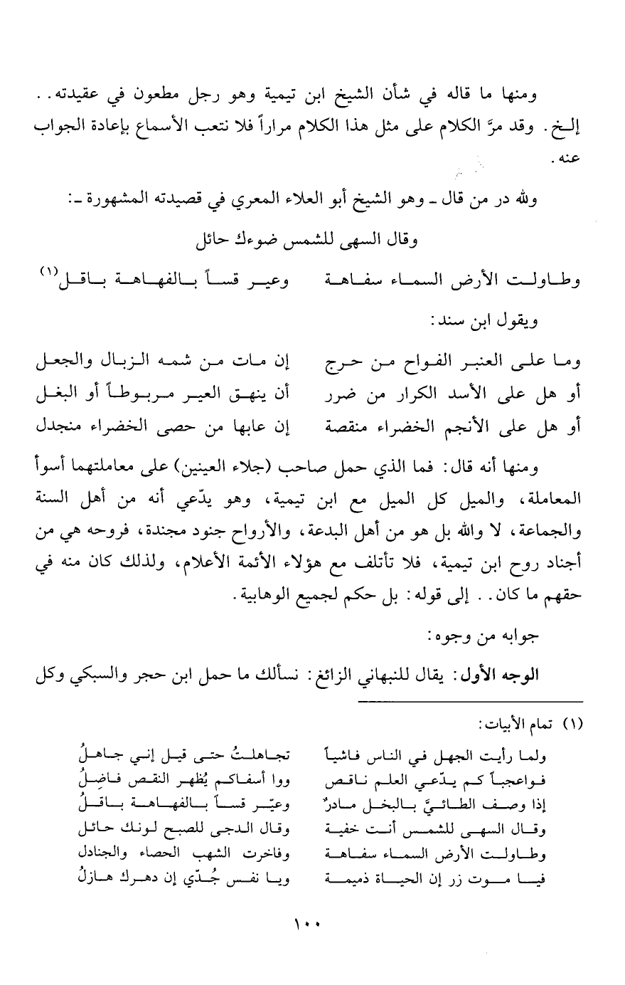 ومنها ما قاله في شأن الشيخ ابن تيمية وهو رجل مطعون في عقيدته.. إلخ. وقد مرَّ الكلام على مثل هذا الكلام مراراً فلا نتعب الأسماع بإعادة الجواب عنه.