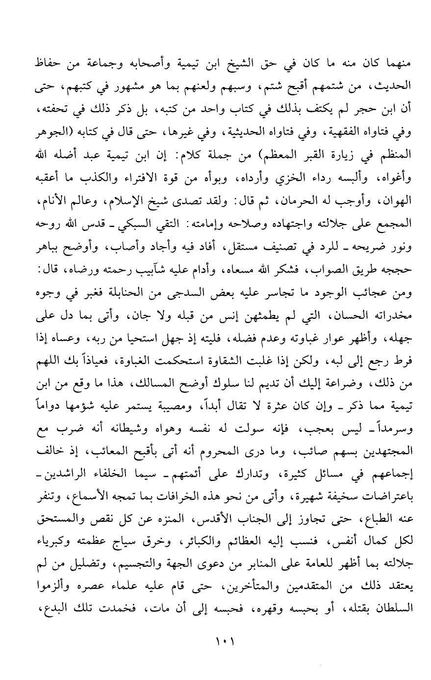 منهما كان منه ما كان في حق الشيخ ابن تيمية وأصحابه وجماعة من حفاظ الحديث، من شتمهم أقبح شتم، وسبهم ولعنهم بما هو مشهور في كتبهم، حتى أن ابن حجر لم يكتف بذلك في كتاب واحد من كتبه، بل ذكر ذلك في تحفته، وفي فتاواه الفقهية، وفي فتاواه الحديثية، وفي غيرها، حتى قال في كتابه "الجوهر المنظم في زيارة القبر المعظم" من جملة كلام: إن ابن تيمية عبد أضله الله وأغواه، وألبسه رداء الخزي وأرداه، وبوأه من قوة الافتراء والكذب ما أعقبه الهوان، وأوجب له الحرمان، ثم قال: ولقد تصدى شيخ الإسلام، وعالم الأنام، المجمع على جلالته واجتهاده وصلاحه وإمامته: التقي السبكي- قدس الله روحه ونور ضريحه- للرد في تصنيف مستقل، أفاد فيه وأجاد وأصاب، وأوضح بباهر حججه طريق الصواب، فشكر الله مسعاه، وأدام عليه شآبيب رحمته ورضاه، قال: ومن عجائب الوجود ما تجاسر عليه بعض السدجى من الحنابلة فغبر في وجوه مخدراته الحسان، التي لم يطمثهن إنس من قبله ولا جان، وأتى بما دل على جهله، وأظهر عوار غباوته وعدم فضله، فليته إذ جهل استحيا من ربه، وعساه إذا فرط رجع إلى لبه، ولكن إذا غلبت الشقاوة استحكمت الغباوة، فعياذاً بك اللهم من ذلك، وضراعة إليك أن تديم لنا سلوك أوضح المسالك، هذا ما وقع من ابن تيمية مما ذكر- وإن كان عثرة لا تقال أبداً، ومصيبة يستمر عليه شؤمها دواماً وسرمداً- ليس بعجب، فإنه سولت له نفسه وهواه وشيطانه أنه ضرب مع المجتهدين بسهم صائب، وما درى المحروم أنه أتى بأقبح المعائب، إذ خالف إجماعهم في مسائل كثيرة، وتدارك على أئمتهم- سيما الخلفاء الراشدين- باعتراضات سخيفة شهيرة، وأتى من نحو هذه الخرافات بما تمجه الأسماع، وتنفر عنه الطباع، حتى تجاوز إلى الجناب الأقدس، المنزه عن كل نقص والمستحق لكل كمال أنفس، فنسب إليه العظائم والكبائر، وخرق سياج عظمته وكبرياء جلالته بما أظهر للعامة على المنابر من دعوى الجهة والتجسيم، وتضليل من لم يعتقد ذلك من المتقدمين والمتأخرين، حتى قام عليه علماء عصره وألزموا السلطان بقتله، أو بحبسه وقهره، فحبسه إلى أن مات، فخمدت تلك البدع،