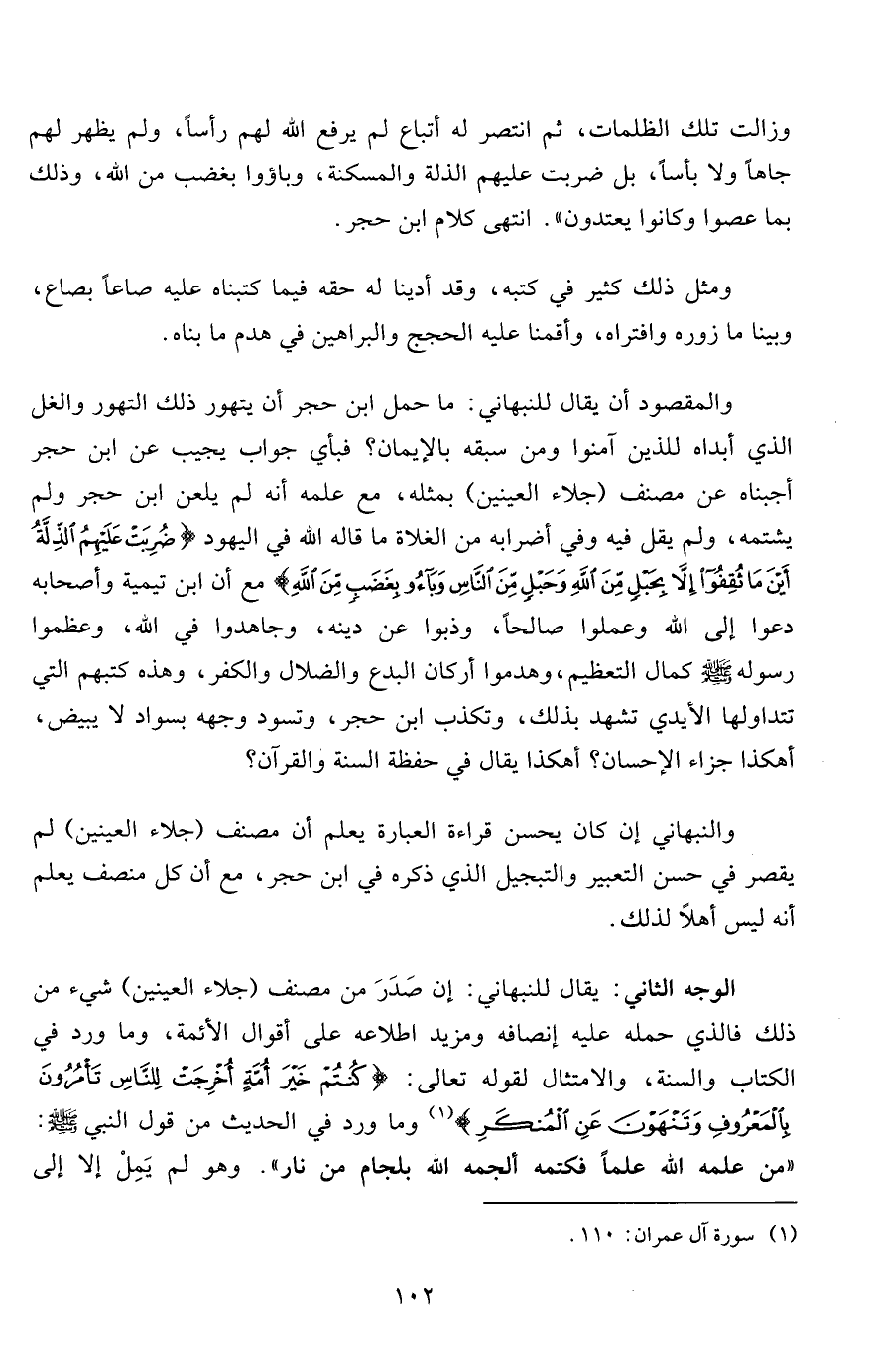 والمقصود أن يقال للنبهاني: ما حمل ابن حجر أن يتهور ذلك التهور والغل الذي أبداه للذين آمنوا ومن سبقه بالإيمان؟ فبأي جواب يجيب عن ابن حجر أجبناه عن مصنف "جلاء العينين" بمثله، مع علمه أنه لم يلعن ابن حجر ولم يشتمه، ولم يقل فيه وفي أضرابه من الغلاة ما قاله الله في اليهود {ضُرِبَتْ عَلَيْهِمُ الذِّلَّةُ أَيْنَ مَا ثُقِفُوا إِلَّا بِحَبْلٍ مِنَ اللَّهِ وَحَبْلٍ مِنَ النَّاسِ وَبَاءُوا بِغَضَبٍ مِنَ اللَّهِ} مع أن ابن تيمية وأصحابه دعوا إلى الله وعملوا صالحاً، وذبوا عن دينه، وجاهدوا في الله، وعظموا رسوله صلى الله عليه وسلم كمال التعظيم، وهدموا أركان البدع والضلال والكفر، وهذه كتبهم التي تتداولها الأيدي تشهد بذلك، وتكذب ابن حجر، وتسود وجهه بسواد لا يبيض، أهكذا جزاء الإحسان؟ أهكذا يقال في حفظة السنة والقران؟