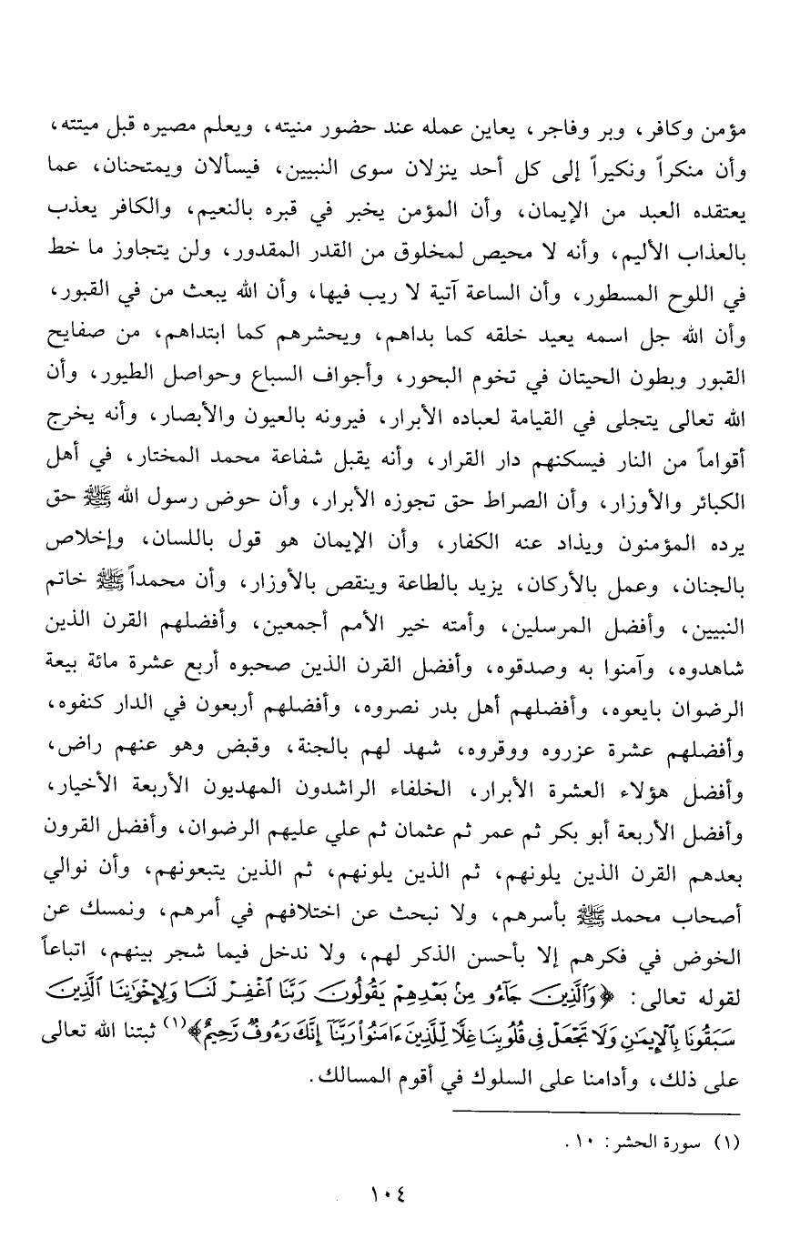مؤمن وكافر، وبر وفاجر، يعاين عمله عند حضور منيته، ويعلم مصيره قبل ميتته وأن منكراً ونكيراً إلى كل أحد ينزلان سوى النبيين، فيسألان ويمتحنان، عما يعتقده العبد من الإيمان، وأن المؤمن يخبر في قبره بالنعيم، والكافر يعذب بالعذاب الأليم، وأنه لا محيص لمخلوق من القدر المقدور، ولن يتجاوز ما خط في اللوح المسطور، وأن الساعة آتية لا ريب فيها، وأن الله يبعث من في القبور، وأن الله جل اسمه يعيد خلقه كما بداهم، ويحشرهم كما ابتداهم، من صفايح القبور وبطون الحيتان في تخوم البحور، وأجواف السباع وحواصل الطيور، وأن الله تعالى يتجلى في القيامة لعباده الأبرار، فيرونه بالعيون والأبصار، وأنه يخرج أقواماً من النار فيسكنهم دار القرار، وأنه يقبل شفاعة محمد المختار، في أهل الكبائر والأوزار، وأن الصراط حق تجوزه الأبرار، وأن حوض رسول الله صلى الله عليه وسلم حق يرده المؤمنون ويذاد عنه الكفار، وأن الإيمان هو قول باللسان، وإخلاص بالجنان، وعمل بالأركان، يزيد بالطاعة وينقص بالأوزار، وأن محمداً صلى الله عليه وسلم خاتم النبيين، وأفضل المرسلين، وأمته خير الأمم أجمعين، وأفضلهم القرن الذين شاهدوه، وآمنوا به وصدقوه، وأفضل القرن الذين صحبوه أربع عشرة مائة بيعة الرضوان بايعوه، وأفضلهم أهل بدر نصروه، وأفضلهم أربعون في الدار كنفوه، وأفضلهم عشرة عزروه ووقروه، شهد لهم بالجنة، وقبض وهو عنهم راض، وأفضل هؤلاء العشرة الأبرار، الخلفاء الراشدون المهديون الأربعة الأخيار، وأفضل الأربعة أبو بكر ثم عمر ثم عثمان ثم علي عليهم الرضوان، وأفضل القرون بعدهم القرن الذين يلونهم، ثم الذين يلونهم، ثم الذين يتبعونهم، وأن نوالي أصحاب محمد صلى الله عليه وسلم بأسرهم، ولا نبحث عن اختلافهم في أمرهم، ونمسك عن الخوض في فكرهم إلا بأحسن الذكر لهم، ولا ندخل فيما شجر بينهم، اتباعاً لقوله تعالى: {وَالَّذِينَ جَاءُوا مِنْ بَعْدِهِمْ يَقُولُونَ رَبَّنَا اغْفِرْ لَنَا وَلِإِخْوَانِنَا الَّذِينَ سَبَقُونَا بِالْأِيمَانِ وَلا تَجْعَلْ فِي قُلُوبِنَا غِلّاً لِلَّذِينَ آمَنُوا رَبَّنَا إِنَّكَ رَؤُوفٌ رَحِيمٌ} 1 ثبتنا الله تعالى على ذلك، وأدامنا على السلوك في أقوم المسالك.