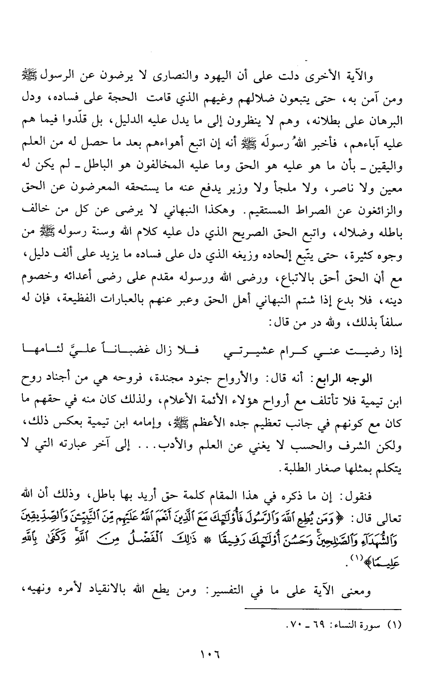 والآية الأخرى دلت على أن اليهود والنصارى لا يرضون عن الرسول صلى الله عليه وسلم ومن آمن به، حتى يتبعون ضلالهم وغيهم الذي قامت الحجة على فساده، ودل البرهان على بطلانه، وهم لا ينظرون إلى ما يدل عليه الدليل، بل قلّدوا فيما هم عليه آباءهم، فأخبر اللهُ رسولَه صلى الله عليه وسلم أنه إن اتبع أهواءهم بعد ما حصل له من العلم واليقين- بأن ما هو عليه هو الحق وما عليه المخالفون هو الباطل- لم يكن له معين ولا ناصر، ولا ملجأ ولا وزير يدفع عنه ما يستحقه المعرضون عن الحق والزائغون عن الصراط المستقيم. وهكذا النبهاني لا يرضى عن كل من خالف باطله وضلاله، واتبع الحق الصريح الذي دل عليه كلام الله وسنة رسوله صلى الله عليه وسلم من وجوه كثيرة، حتى يتّبع إلحاده وزيغه الذي دل على فساده ما يزيد على ألف دليل، مع أن الحق أحق بالاتباع، ورضى الله ورسوله مقدم على رضى أعدائه وخصوم دينه، فلا بدع إذا شتم النبهاني أهل الحق وعبر عنهم بالعبارات الفظيعة، فإن له سلفاً بذلك، ولله در من قال: