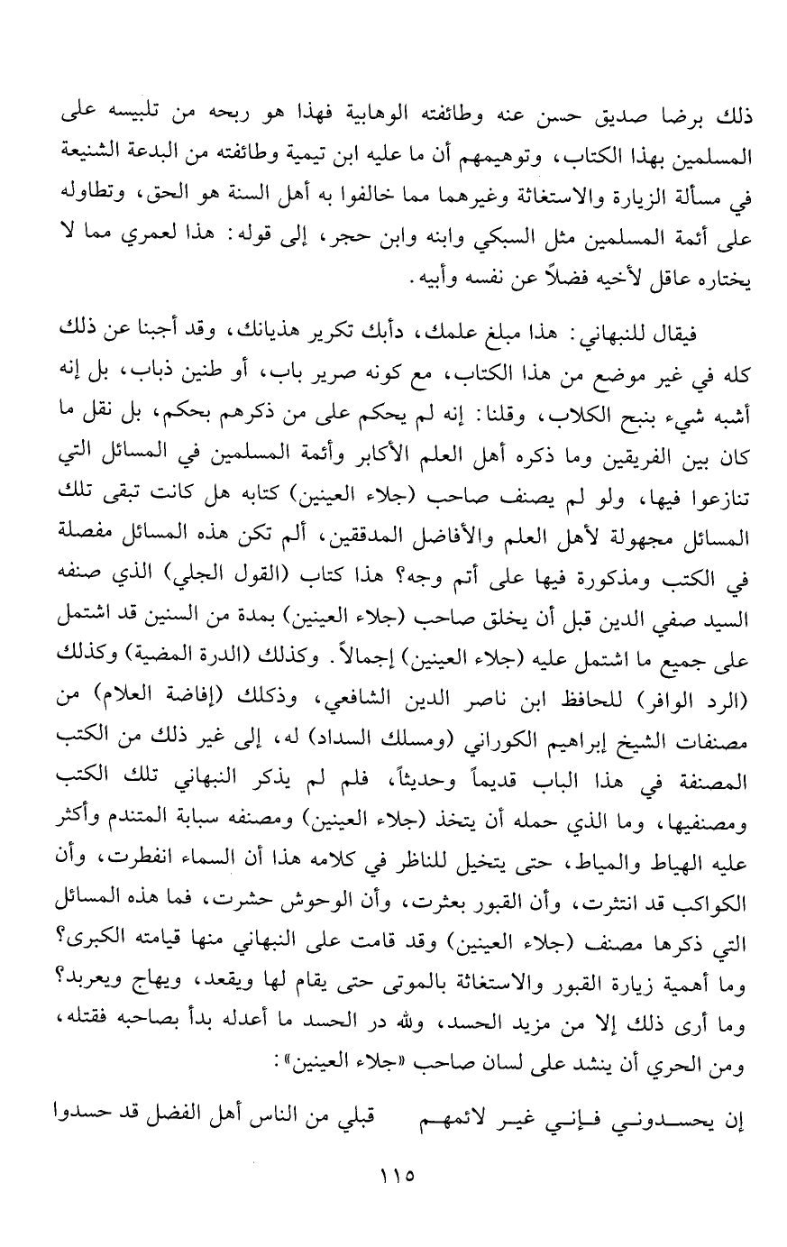 فيقال للنبهاني: هذا مبلغ علمك، دأبك تكرير هذيانك، وقد أجبنا عن ذلك كله في غير موضع من هذا الكتاب، مع كونه صرير باب، أو طنين ذباب، بل إنه أشبه شيء بنبح الكلاب، وقلنا: إنه لم بحكم على من ذكرهم بحكم، بل نقل ما كان بين الفريقين وما ذكره أهل العلم الأكابر وأئمة المسلمين في المسائل التي تنازعوا فيها، ولو لم يصنف صاحب "جلاء العينين" كتابه هل كانت تبقى تلك المسائل مجهولة لأهل العلم والأفاضل المدققين، ألم تكن هذه المسائل مفصلة في الكتب ومذكورة فيها على أتم وجه؟ هذا كتاب "القول الجلي" الذي صنفه السيد صفي الدين قبل أن يخلق صاحب "جلاء العينين" بمدة من السنين قد اشتمل على جميع ما اشتمل عليه "جلاء العينين" إجمالاً. وكذلك "الدرة المضية" وكذلك "الرد الوافر" للحافظ ابن ناصر الدين الشافعي، وكذلك "إفاضة العلام" من مصنفات الشيخ إبراهيم الكوراني "ومسلك السداد" له، إلى غير ذلك من الكتب المصنفة في هذا الباب قديماً وحديثاً، فلم لم يذكر النبهاني تلك الكتب ومصنفيها، وما الذي حمله أن يتخذ "جلاء العينين" ومصنفه سبابة المتندم وأكثر عليه الهياط والمياط، حتى يتخيل للناظر في كلامه هذا أن السماء انفطرت، وأن الكواكب قد انتثرت، وأن القبور بعثرت، وأن الوحوش حشرت، فما هذه المسائل التي ذكرها مصنف "جلاء العينين" وقد قامت على النبهاني منها قيامته الكبرى؟ وما أهمية زيارة القبور والاستغاثة بالموتى حتى يقام لها ويقعد، ويهاج ويعربد؟ وما أرى ذلك إلا من مزيد الحسد، ولله در الحسد ما أعدله بدأ بصاحبه فقتله، ومن الحري أن ينشد على لسان صاحب "جلاء العينين":