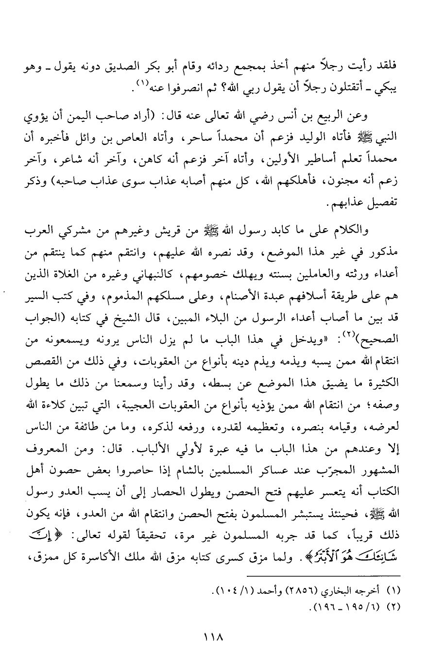 والكلام على ما كابد رسول الله صلى الله عليه وسلم من قريش وغيرهم من مشركي العرب مذكور في غير هذا الموضع، وقد نصره الله عليهم، وانتقم منهم كما ينتقم من أعداء ورثته والعاملين بسنته ويهلك خصومهم، كالنبهاني وغيره من الغلاة الذين هم على طريقة أسلافهم عبدة الأصنام، وعلى مسلكهم المذموم، وفي كتب السير قد بين ما أصاب أعداء الرسول من البلاء المبين، قال الشيخ قد كتابه (الجواب الصحيح2: "ويدخل في هذا الباب ما لم يزل الناس يرونه ويسمعونه من انتقام الله ممن يسبه ويذمه ويذم دينه بأنواع من العقوبات، وفي ذلك من القصص الكثيرة ما يضيق هذا الموضع عن بسطه، وقد رأينا وسمعنا من ذلك ما يطول وصفه؛ من انتقام الله ممن يؤذيه بأنواع من العقوبات العجيبة، التي تبين كلاءة الله لعرضه، وقيامه بنصره، وتعظيمه لقدره، ورفعه لذكره، وما من طائفة من الناس إلا وعندهم من هذا الباب ما فيه عبرة لأولى الألباب. قال: ومن المعروف المشهور المجرّب عند عساكر المسلمين بالشام إذا حاصروا بعض حصون أهل الكتاب أنه يتعسر عليهم فتح الحصن ويطول الحصار إلى أن يسب العدو رسول الله صلى الله عليه وسلم، فحينئذ يستبشر المسلمون بفتح الحصن وانتقام الله من العدو، فإنه يكون ذلك قريباً، كما قد جربه المسلمون غير مرة، تحقيقاً لقوله تعالى: {إِنَّ شَانِئَكَ هُوَ الْأَبْتَرُ} . ولما مزق كسرى كتابه مزق الله ملك الأكاسرة كل ممزق،