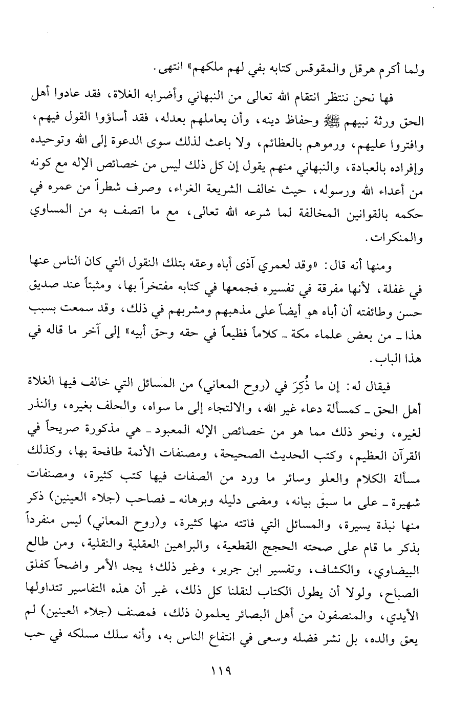 فيقال له: إن ما ذُكِرَ في "روح المعاني" من المسائل التي خالف فيها الغلاة أهل الحق- كمسألة دعاء غير الله، والالتجاء إلى ما سواه، والحلف بغيره، والنذر لغيره، ونحو ذلك مما هو من خصائص الإله المعبود- هي مذكورة صريحاً في القرآن العظيم، وكتب الحديث الصحيحة، ومصنفات الأئمة طافحة بها، وكذلك مسألة الكلام والعلو وسائر ما ورد من الصفات فيها كتب كثيرة، ومصنفات شهيرة- على ما سبق بيانه، ومضى دليله وبرهانه- فصاحب "جلاء العين" ذكر منها نبذة يسيرة، والمسائل التي فاتته منها كثيرة، و "روح المعاني" ليس منفرداً بذكر ما قام على صحته الحجج القطعية، والبراهين العقلية والنقلية، ومن طالع البيضاوي، والكشاف، وتفسير ابن جرير، وغير ذلك؛ يجد الأمر واضحاً كفلق الصباح، ولولا أن يطول الكتاب لنقلنا كل ذلك، غير أن هذه التفاسير تتداولها الأيدي، والمنصفون من أهل البصائر يحلمون ذلك، فمصنف "جلاء العينين" لم يعق والده، بل نشر فضله وسعى في انتفاع الناس به، وأنه سلك مسلكه في حب